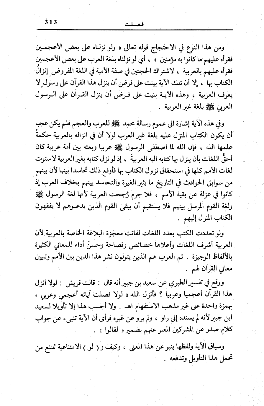 وَلَوْ تَعَدَّدَتِ الْكُتُبُ بِعَدَدِ اللُّغَاتِ لَفَاتَتْ مُعْجِزَةُ الْبَلَاغَةِ الْخَاصَّةِ بِالْعَرَبِيَّةِ لِأَنَّ الْعَرَبِيَّةَ أَشْرَفُ اللُّغَاتِ وَأَعْلَاهَا خَصَائِصَ وَفَصَاحَةً وَحُسْنَ أَدَاءٍ لِلْمَعَانِي الْكَثِيرَةِ بِالْأَلْفَاظِ الْوَجِيزَةِ.