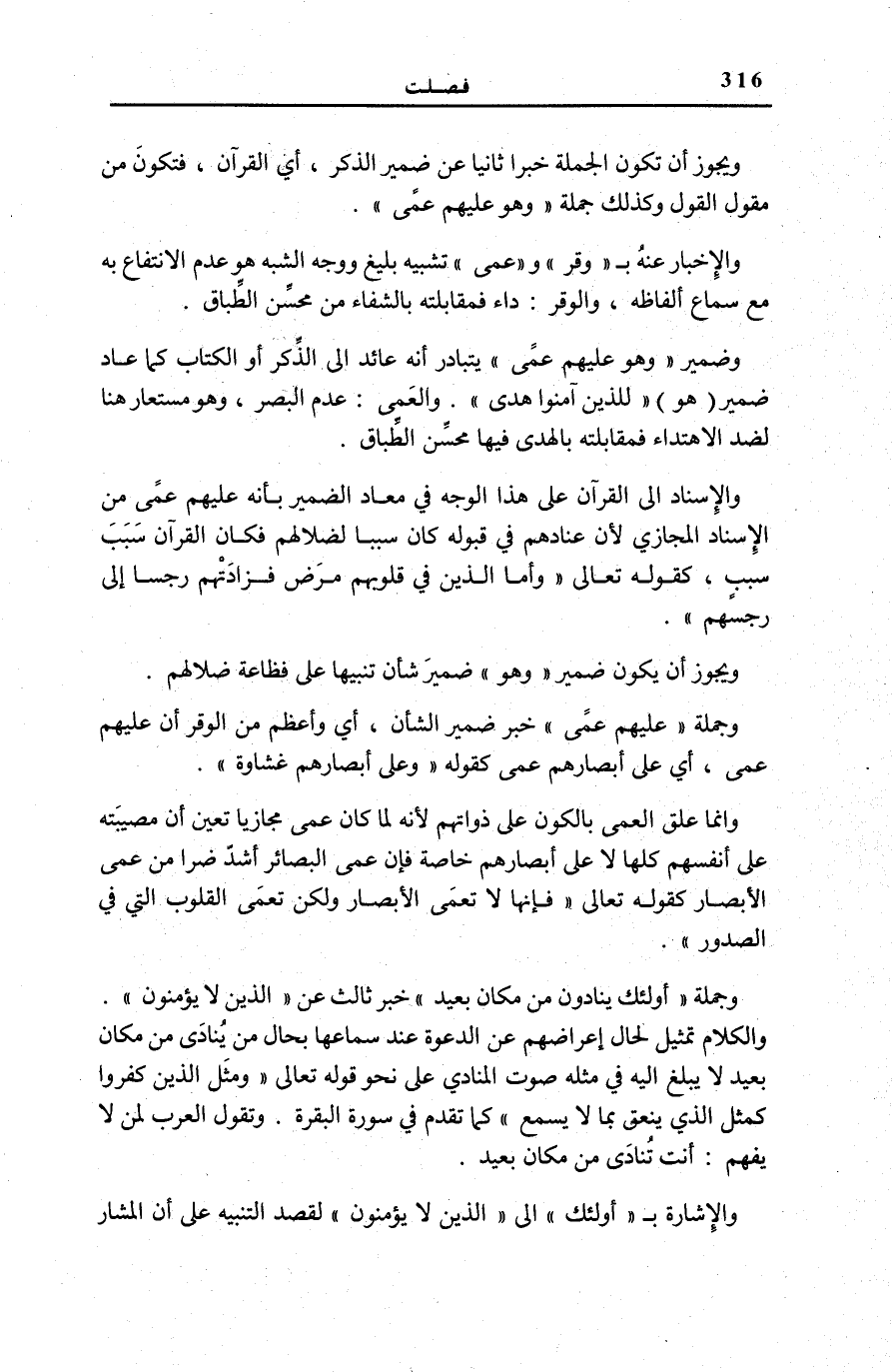 وَالْإِسْنَادُ إِلَى الْقُرْآنِ عَلَى هَذَا الْوَجْهِ فِي مُعَادِ الضَّمِيرِ بِأَنَّهُ عَلَيْهِمْ عَمًى مِنَ الْإِسْنَادِ الْمَجَازِيِّ لِأَنَّ عِنَادَهُمْ فِي قَبُولِهِ كَانَ سَبَبًا لِضَلَالِهِمْ فَكَانَ الْقُرْآنُ سَبَبَ سَبَبٍ، كَقَوْلِهِ تَعَالَى:
