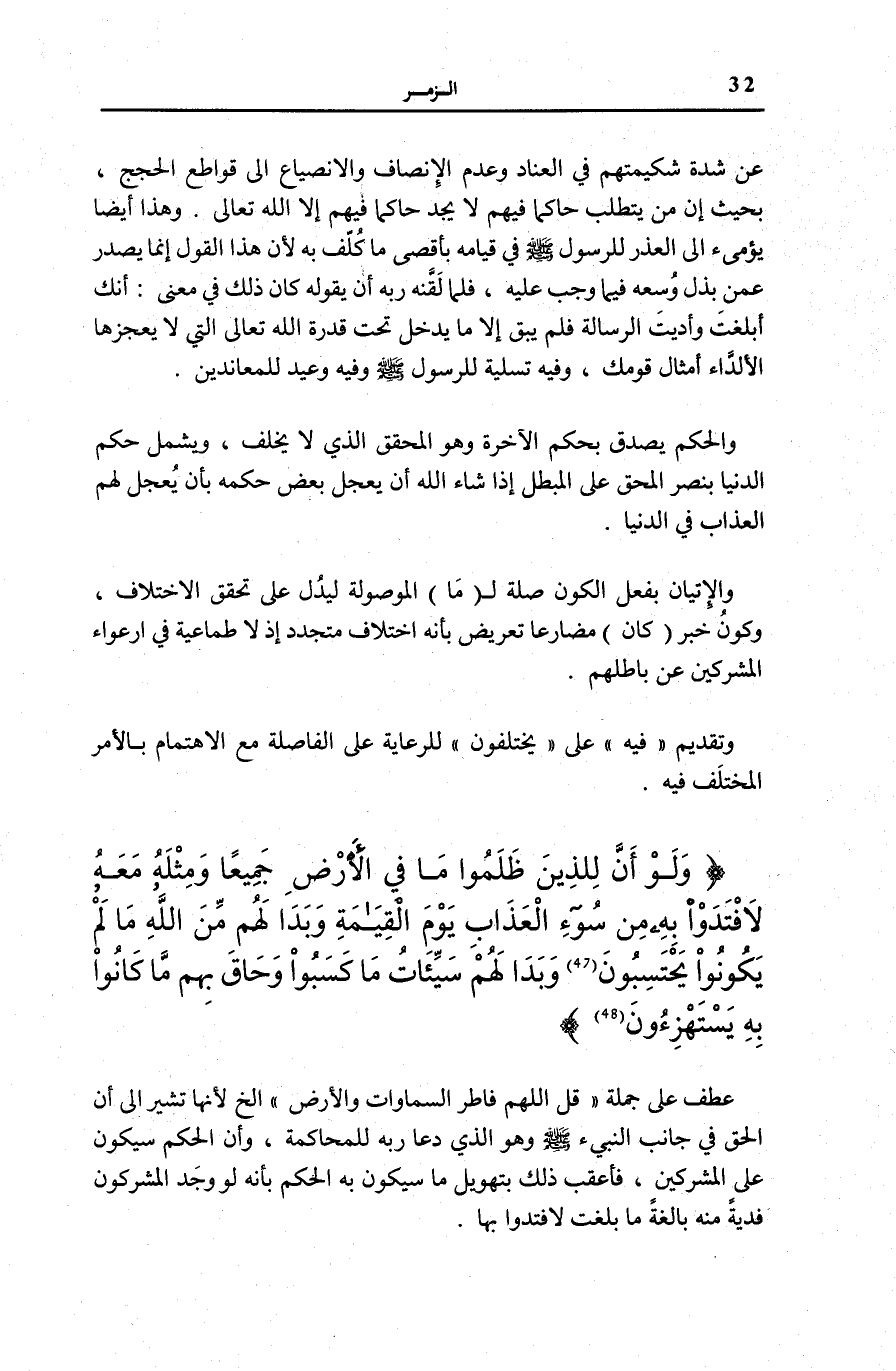 عَطْفٌ عَلَى جُمْلَةِ قُلِ اللَّهُمَّ فاطِرَ السَّماواتِ وَالْأَرْضِ [الزمر: 46] إِلَخْ لِأَنَّهَا تُشِيرُ إِلَى أَنَّ الْحَقَّ فِي جَانِبِ النَّبِيءِ صَلَّى اللهُ عَلَيْهِ وَسَلَّمَ وَهُوَ الَّذِي دَعَا رَبَّهُ لِلْمُحَاكَمَةِ، وَأَنَّ الْحُكْمَ سَيَكُونُ عَلَى الْمُشْرِكِينَ، فَأَعْقَبَ ذَلِكَ بِتَهْوِيلِ مَا سَيَكُونُ بِهِ الْحُكْمُ بِأَنَّهُ لَوْ وَجَدَ الْمُشْرِكُونَ فِدْيَةً مِنْهُ بَالِغَةً مَا بَلَغَتْ لَافْتَدَوْا بِهَا.