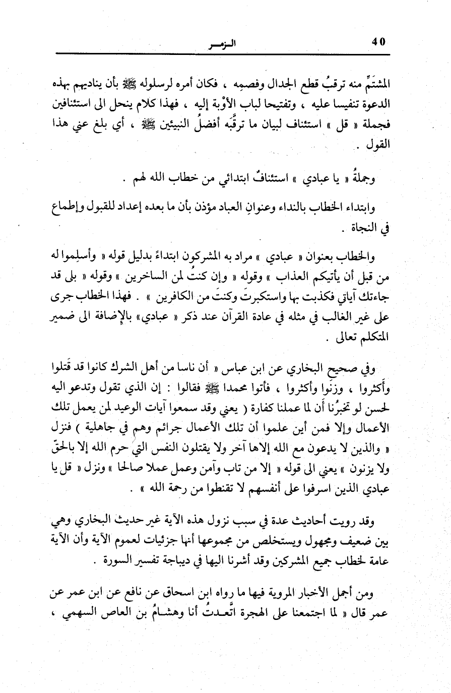 وَالْخطاب بعنوان يَا عِبادِيَ مُرَادٌ بِهِ الْمُشْرِكُونَ ابْتِدَاءً بِدَلِيلِ قَوْلِهِ: وَأَسْلِمُوا لَهُ مِنْ قَبْلِ أَنْ يَأْتِيَكُمُ الْعَذابُ [الزمر: 54] وَقَوْلُهُ: وَإِنْ كُنْتُ لَمِنَ السَّاخِرِينَ [الزمر: 56] وَقَوْلُهُ: بَلى قَدْ جاءَتْكَ آياتِي فَكَذَّبْتَ بِها وَاسْتَكْبَرْتَ وَكُنْتَ مِنَ الْكافِرِينَ [الزمر: 59] .