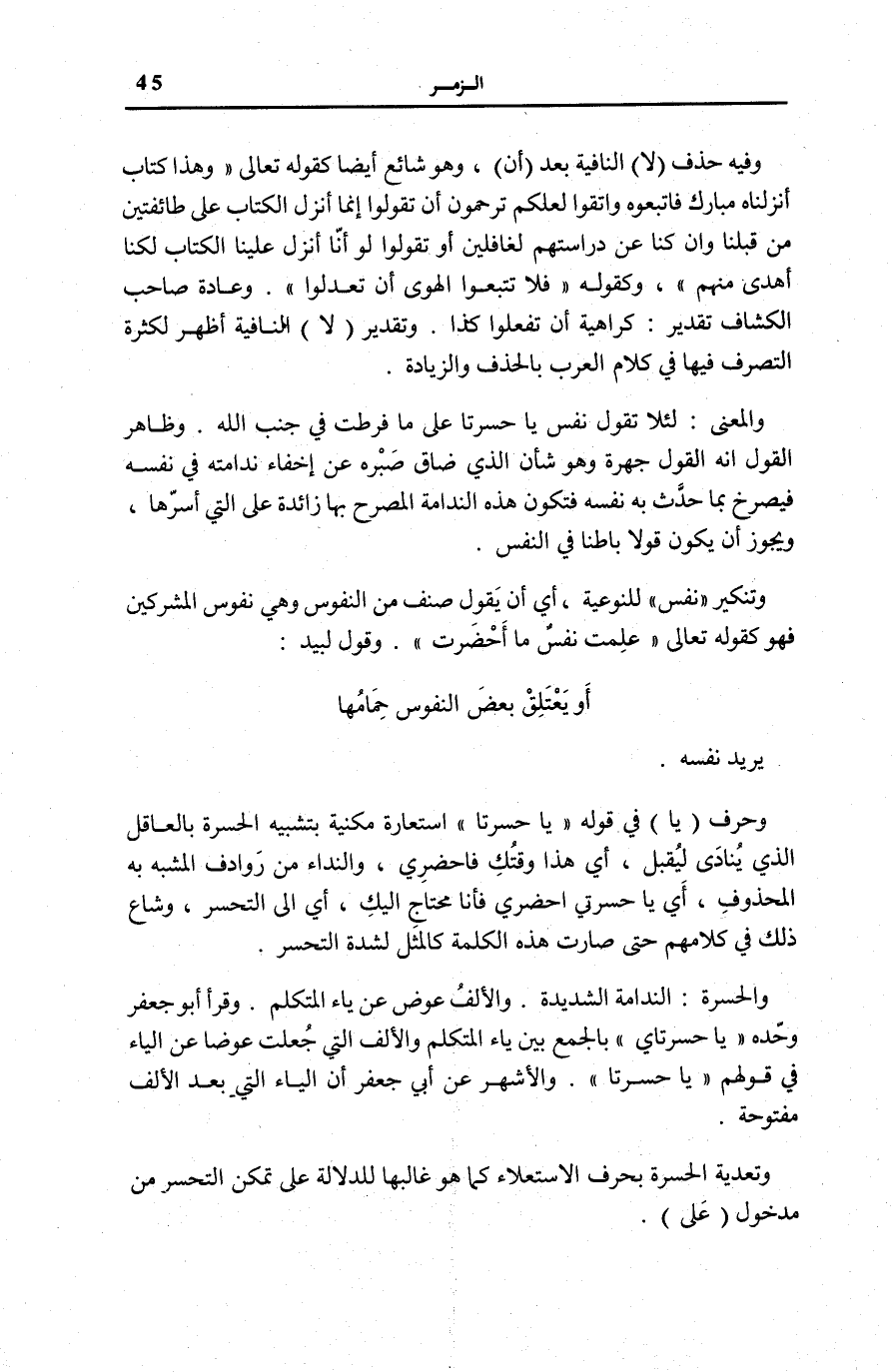 وَالْمَعْنَى: لِئَلَّا تَقُولَ نَفْسٌ يَا حَسْرَتَا عَلَى مَا فَرَّطْتُ فِي جَنْبِ اللَّهِ. وَظَاهِرُ الْقَوْلِ أَنَّهُ الْقَوْلُ جَهْرَةً وَهُوَ شَأْنُ الَّذِي ضَاقَ صَبْرُهُ عَنْ إِخْفَاءِ نَدَامَتِهِ فِي نَفسه فيصرح بِمَا حَدَّثَ بِهِ نَفْسَهُ فَتَكُونُ هَذِهِ النَّدَامَةُ الْمُصَرَّحُ بِهَا زَائِدَةً عَلَى الَّتِي أَسَرَّهَا، وَيَجُوزُ أَنْ يَكُونَ قَوْلًا بَاطِنًا فِي النَّفْسِ. وَتَنْكِيرُ نَفْسٌ لِلنَّوْعِيَّةِ، أَيْ أَنْ يَقُولَ صِنْفٌ مِنَ النُّفُوسِ وَهِيَ نُفُوسُ الْمُشْرِكِينَ فَهُوَ كَقَوْلِهِ تَعَالَى: عَلِمَتْ نَفْسٌ مَا أَحْضَرَتْ [التكوير: 14] . وَقَوْلُ لَبِيدٍ: