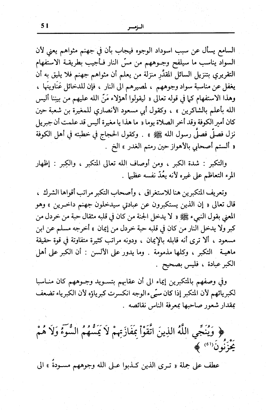 ، أَلَا تَرَى أَنَّهُ قَابَلَهُ بِالْإِيمَانِ، وَدُونَهُ مَرَاتِبُ كَثِيرَةٌ مُتَفَاوِتَةٌ فِي قُوَّةِ حَقِيقَةِ مَاهِيَّةِ التَّكَبُّرِ، وَكُلُّهَا مَذْمُومَةٌ. وَمَا يَدُورُ عَلَى الْأَلْسُنِ: أَنَّ الْكِبْرَ عَلَى أَهْلِ الْكِبْرِ عِبَادَةٌ، فَلَيْسَ بِصَحِيحٍ.