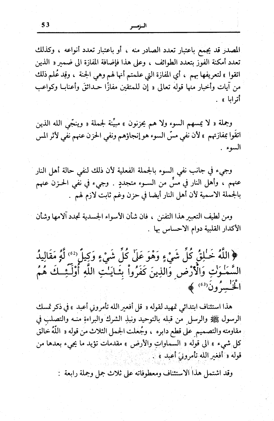 اللَّهُ خالِقُ كُلِّ شَيْءٍ وَهُوَ عَلى كُلِّ شَيْءٍ وَكِيلٌ (62) لَهُ مَقالِيدُ السَّماواتِ وَالْأَرْضِ وَالَّذِينَ كَفَرُوا بِآياتِ اللَّهِ أُولئِكَ هُمُ الْخاسِرُونَ (63)