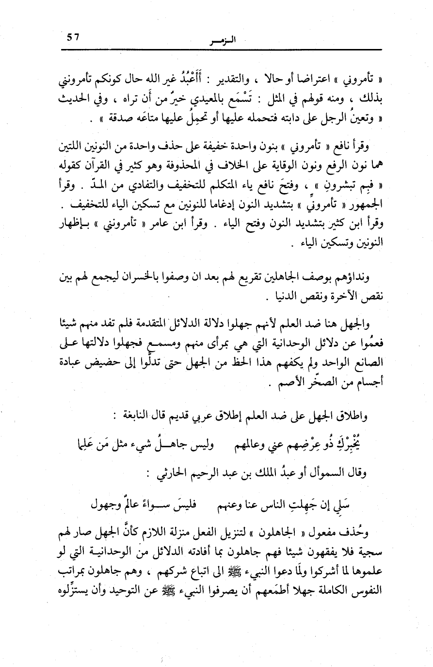 . وَقَرَأَ نَافِعٌ تَأْمُرُونِّي بِنُونٍ وَاحِدَةٍ خَفِيفَةٍ عَلَى حَذْفِ وَاحِدَةٍ مِنَ النُّونَيْنِ اللَّتَيْنِ هَمَّا نُونُ الرَّفْعِ وَنُونُ الْوِقَايَةِ عَلَى الْخِلَافِ فِي الْمَحْذُوفَةِ وَهُوَ كَثِيرٌ فِي الْقُرْآنِ كَقَوْلِهِ: فَبِمَ تُبَشِّرُونَ [الْحجر: 54] ، وَفَتَحَ نَافِعٌ يَاءَ الْمُتَكَلِّمِ لِلتَّخْفِيفِ وَالتَّفَادِي مِنَ الْمَدِّ. وَقَرَأَ الْجُمْهُورُ تَأْمُرُونِّي بِتَشْدِيدِ النُّونِ إِدْغَامًا لِلنُّونَيْنِ مَعَ تَسْكِينِ الْيَاءِ لِلتَّخْفِيفِ. وَقَرَأَ ابْنُ كَثِيرٍ بِتَشْدِيدِ النُّونِ وَفَتْحِ الْيَاءِ. وَقَرَأَ ابْنُ عَامِرٍ تَأْمُرُونَنِي بِإِظْهَارِ النُّونَيْنِ وَتَسْكِينِ الْيَاءِ.