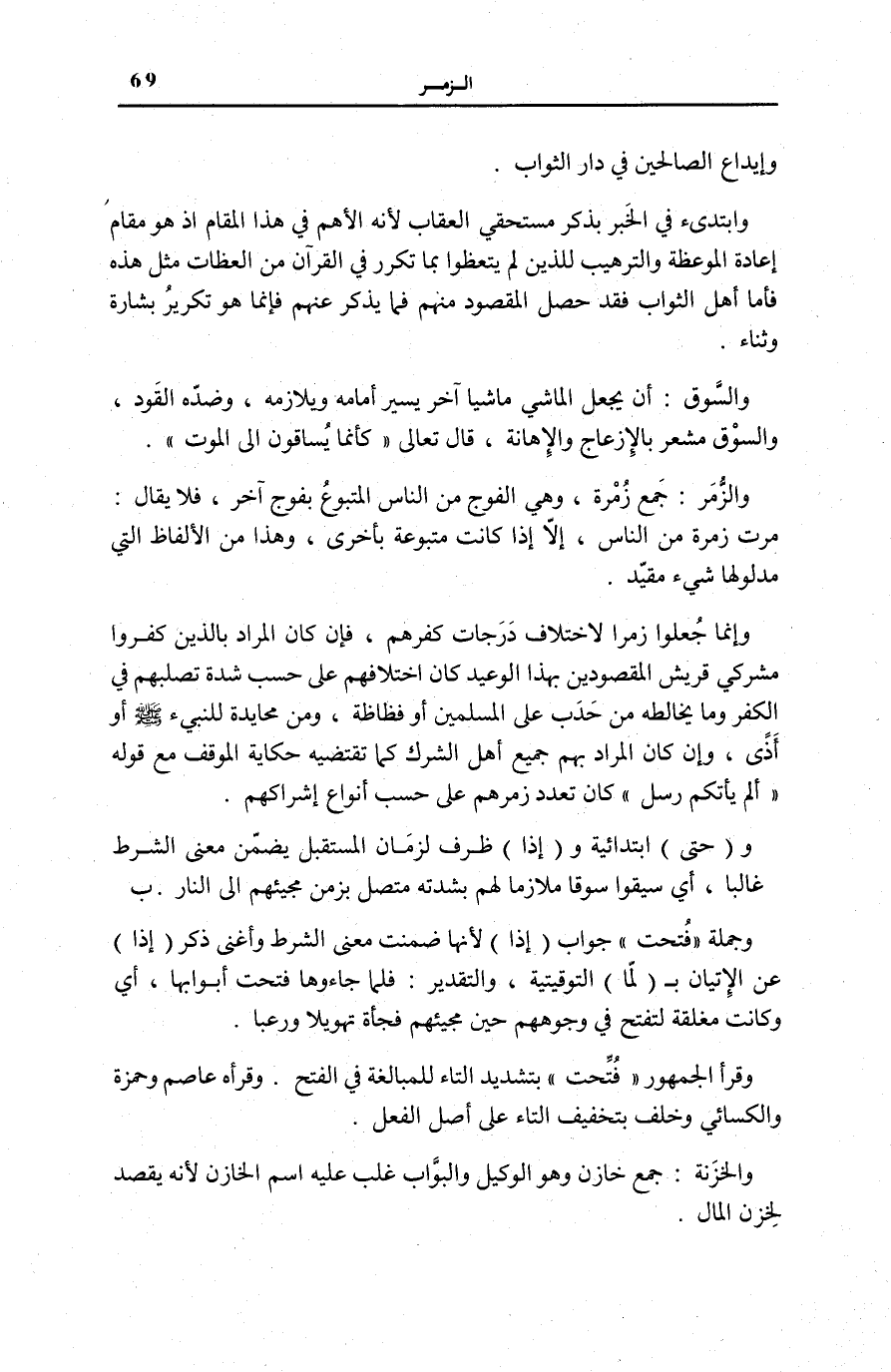 وَالزُّمَرُ: جَمْعُ زُمْرَةٍ، وَهِيَ الْفَوْجُ مِنَ النَّاسِ الْمَتْبُوعِ بِفَوْجٍ آخَرَ، فَلَا يُقَالُ: مَرَّتْ زُمْرَةٌ مِنَ النَّاسِ، إِلَّا إِذَا كَانَتْ مَتْبُوعَةً بِأُخْرَى، وَهَذَا مِنَ الْأَلْفَاظِ الَّتِي مَدْلُولُهَا شَيْءٌ مُقَيَّدٌ.