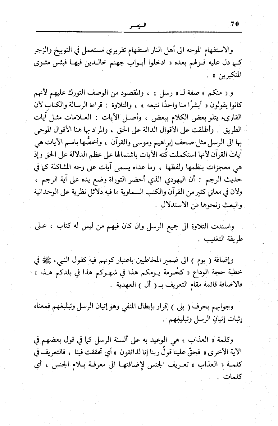 وَالِاسْتِفْهَامُ الْمُوَجَّهُ إِلَى أَهْلِ النَّارِ اسْتِفْهَامٌ تَقْرِيرِيٌّ مُسْتَعْمَلٌ فِي التَّوْبِيخِ وَالزَّجْرِ كَمَا دَلَّ عَلَيْهِ قَوْلُهُمْ بَعْدَهُ: ادْخُلُوا أَبْوابَ جَهَنَّمَ خالِدِينَ فِيها فَبِئْسَ مَثْوَى الْمُتَكَبِّرِينَ.