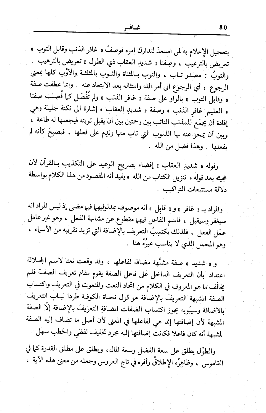وَالْمُرَادُ بِ غافِرِ وقابِلِ أَنَّهُ مَوْصُوفٌ بِمَدْلُولَيْهِمَا فِيمَا مَضَى إِذْ لَيْسَ الْمُرَادُ أَنَّهُ سَيَغْفِرُ وَسَيَقْبَلُ، فَاسْمُ الْفَاعِلِ فِيهِمَا مَقْطُوعٌ عَنْ مُشَابَهَةِ الْفِعْلِ، وَهُوَ غَيْرُ عَامِلٍ عَمَلَ الْفِعْلِ، فَلِذَلِكَ يَكْتَسِبُ التَّعْرِيفَ بِالْإِضَافَةِ الَّتِي تَزِيدُ تَقْرِيبَهُ مِنَ الْأَسْمَاءِ، وَهُوَ الْمَحْمَلُ الَّذِي لَا يُنَاسِبُ غَيْرَهُ هُنَا.
