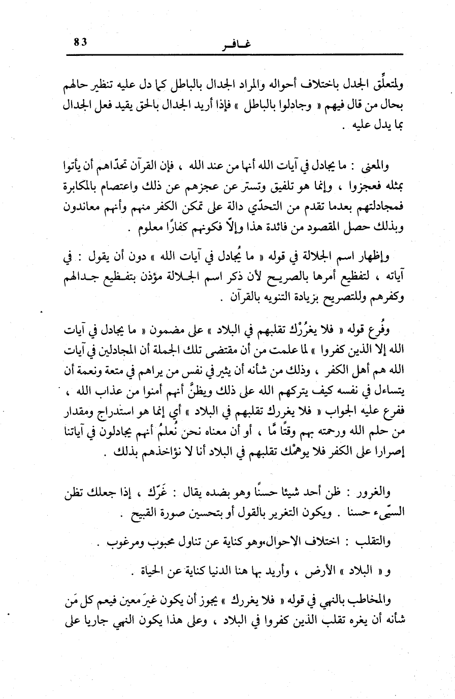وَالْمَعْنَى: مَا يُجَادِلُ فِي آيَاتِ اللَّهِ أَنَّهَا مِنْ عِنْدِ اللَّهِ، فَإِنَّ الْقُرْآنَ تَحَدَّاهُمْ أَنْ يَأْتُوا بِمِثْلِهِ فَعَجَزُوا، وَإِنَّمَا هُوَ تَلْفِيقٌ وَتَسَتُّرٌ عَنْ عَجْزِهِمْ عَنْ ذَلِكَ وَاعْتِصَامٌ بالمكابرة فمجادلتهم بعد مَا تَقَدَّمَ مِنَ التَّحَدِّي دَالَّةٌ عَلَى تَمَكُّنِ الْكُفْرِ مِنْهُمْ وَأَنَّهُمْ مُعَانِدُونَ وَبِذَلِكَ حَصَلَ الْمَقْصُودُ مِنْ فَائِدَةِ هَذَا وَإِلَّا فَكَوْنُهُمْ كُفَّارًا مَعْلُومٌ.