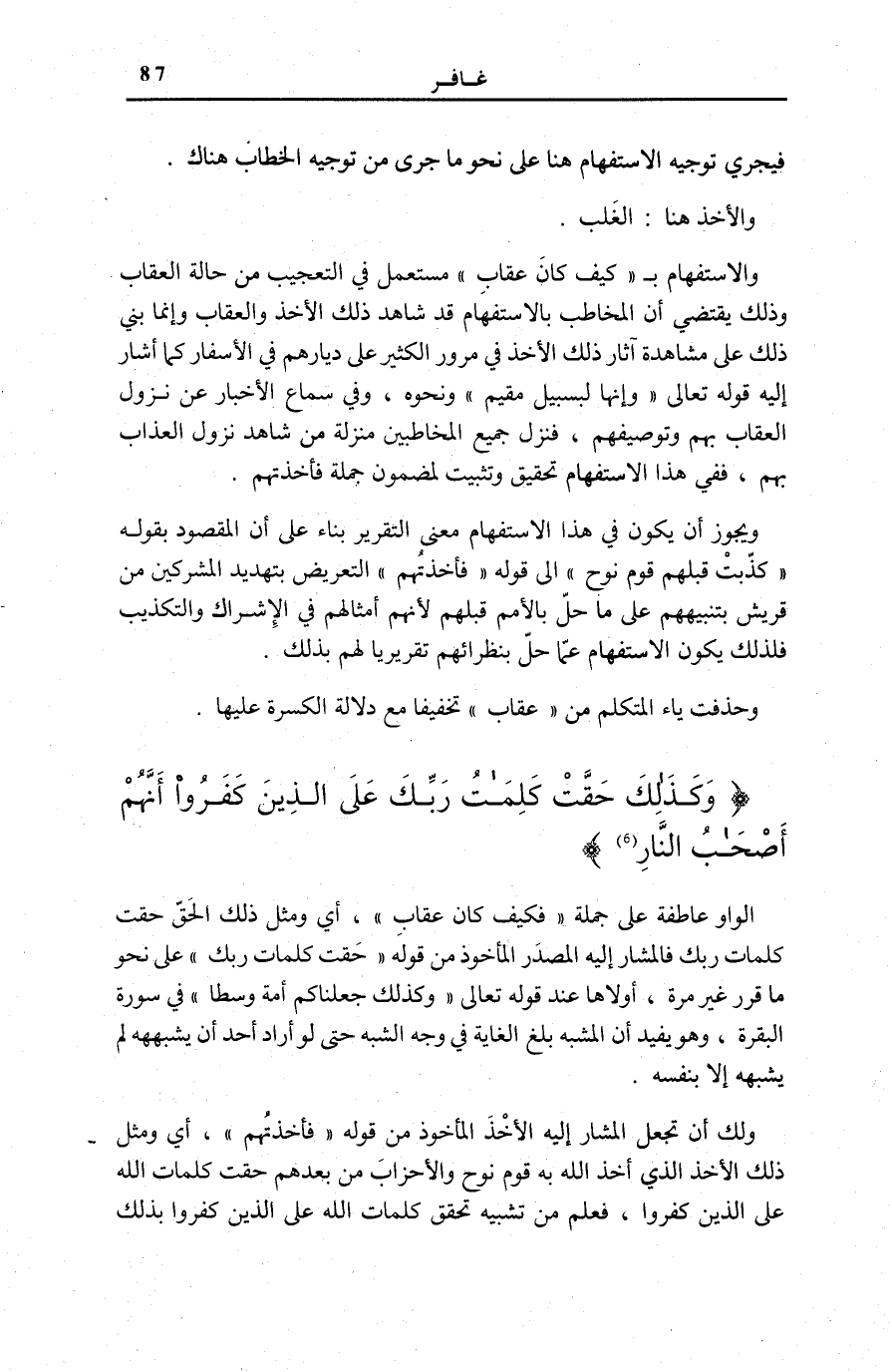 وَلَكَ أَنْ تَجْعَلَ الْمُشَارَ إِلَيْهِ الْأَخْذَ الْمَأْخُوذَ مِنْ قَوْله: فَأَخَذْتُهُمْ [غَافِر: 5] ، أَيْ وَمِثْلُ ذَلِكَ الْأَخْذِ الَّذِي أَخَذَ اللَّهُ بِهِ قَوْمَ نُوحٍ وَالْأَحْزَابَ مِنْ بَعْدِهِمْ حَقَّتْ كَلِمَاتُ اللَّهِ عَلَى الَّذِينَ كَفَرُوا، فَعُلِمَ مِنْ تَشْبِيهِ تَحَقُّقِ كَلِمَاتِ اللَّهِ عَلَى الَّذِينَ كَفَرُوا بِذَلِكَ