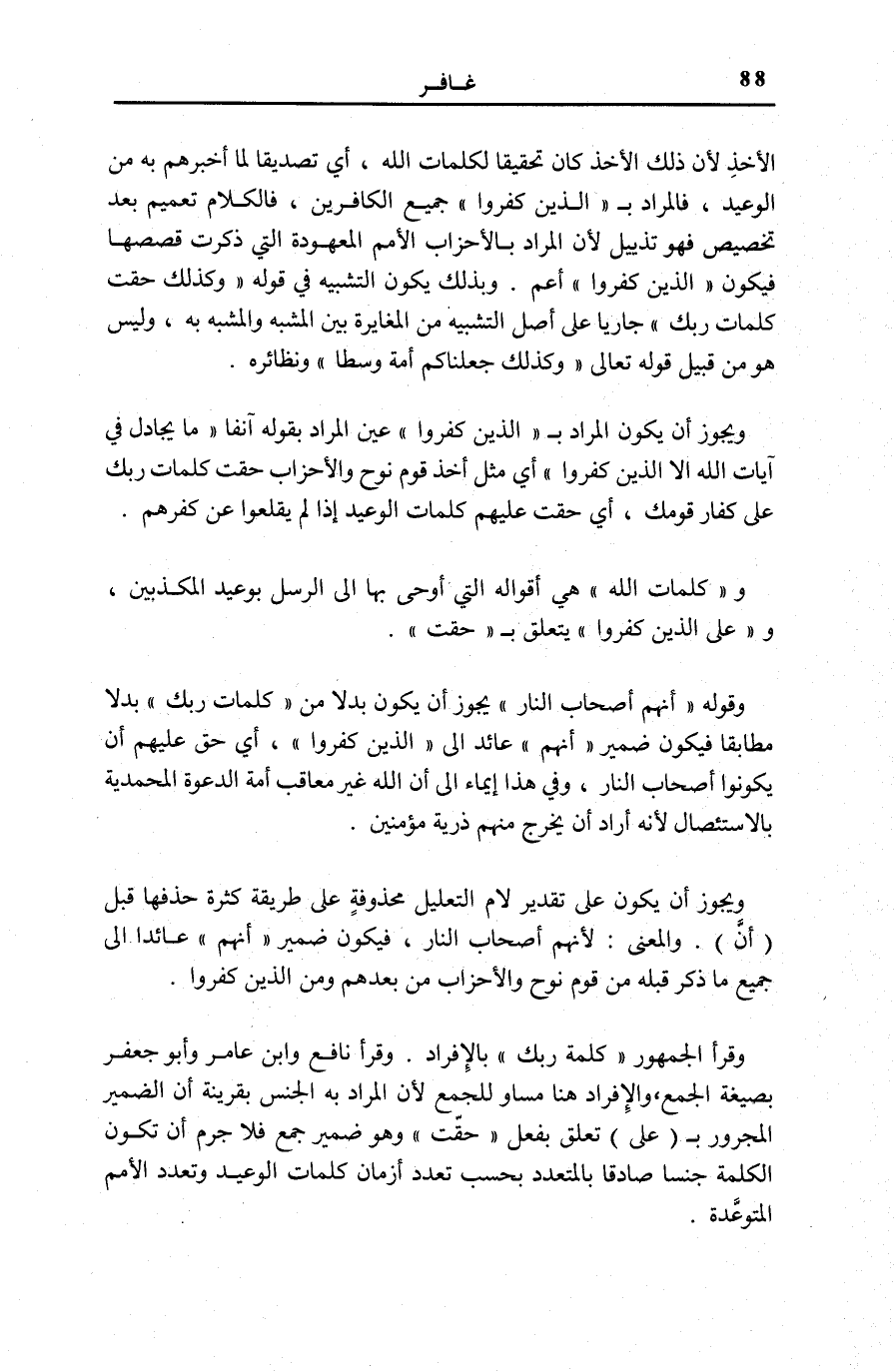 وَيَجُوزُ أَنْ يَكُونَ الْمُرَادُ بِ الَّذِينَ كَفَرُوا عَيْنَ الْمُرَادِ بِقَوْلِهِ آنِفًا: مَا يُجادِلُ فِي آياتِ اللَّهِ إِلَّا الَّذِينَ كَفَرُوا [غَافِر: 4] أَيْ مِثْلَ أَخْذِ قَوْمِ نُوحٍ وَالْأَحْزَابِ حَقَّتْ كَلِمَاتُ رَبِّكَ عَلَى كُفَّارِ قَوْمِكَ، أَيْ حَقَّتْ عَلَيْهِمْ كَلِمَاتُ الْوَعِيدِ إِذَا لَمْ يُقْلِعُوا عَنْ كُفْرِهِمْ.