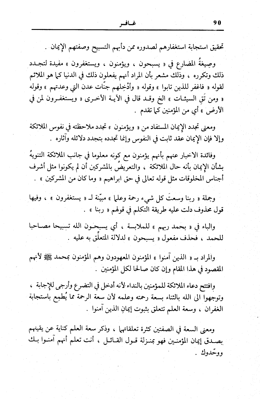 وَمَعْنَى تُجَدُّدِ الْإِيمَانِ الْمُسْتَفَادِ مِنْ وَيُؤْمِنُونَ تَجَدُّدُ مُلَاحَظَتِهِ فِي نُفُوسِ الْمَلَائِكَةِ وَإِلَّا فَإِنَّ الْإِيمَانَ عَقْدٌ ثَابِتٌ فِي النُّفُوسِ وَإِنَّمَا تُجَدُّدُهُ بِتَجَدُّدِ دَلَائِلِهِ وَآثَارِهِ. وَفَائِدَةُ الْإِخْبَارِ عَنْهُمْ بِأَنَّهُمْ يُؤْمِنُونَ مَعَ كَوْنِهِ مَعْلُومًا فِي جَانِبِ الْمَلَائِكَةِ التَّنْوِيهُ بِشَأْنِ الْإِيمَانِ بِأَنَّهُ حَالُ الْمَلَائِكَةِ، وَالتَّعْرِيضُ بِالْمُشْرِكِينَ أَنْ لَمْ يَكُونُوا مِثْلَ أَشْرَفِ أَجْنَاسِ الْمَخْلُوقَاتِ مِثْلُ قَوْلِهِ تَعَالَى فِي حَقِّ إِبْرَاهِيمَ وَما كانَ مِنَ الْمُشْرِكِينَ [الْأَنْعَام: 161] .
