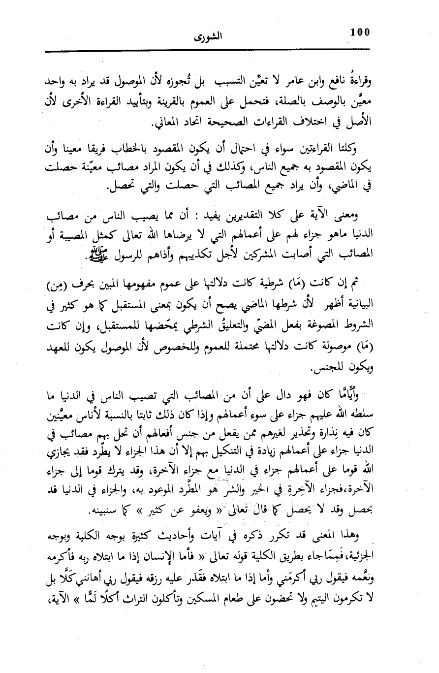 وَأَيًّا مَا كَانَ فَهُوَ دَالٌّ عَلَى أَنَّ مِنَ الْمَصَائِبِ الَّتِي تُصِيبُ النَّاسَ فِي الدُّنْيَا مَا سَلَّطَهُ اللَّهُ عَلَيْهِمْ جَزَاءً عَلَى سُوءِ أَعْمَالِهِمْ وَإِذَا كَانَ ذَلِكَ ثَابِتًا بِالنِّسْبَةِ لِأُنَاسٍ مُعَيَّنِينَ كَانَ فِيهِ نِذَارَةٌ وَتَحْذِيرٌ لِغَيْرِهِمْ مِمَّنْ يَفْعَلُ مِنْ جِنْسِ أَفْعَالِهِمْ أَنْ تَحِلَّ بِهِمْ مَصَائِبُ فِي الدُّنْيَا جَزَاءً عَلَى أَعْمَالِهِمْ زِيَادَةً فِي التَّنْكِيلِ بِهِمْ إِلَّا أَنَّ هَذَا الْجَزَاءَ لَا يَطَّرِدُ فَقَدْ يُجَازِي اللَّهُ قُومًا عَلَى أَعْمَالِهِمْ جَزَاءً فِي الدُّنْيَا مَعَ جَزَاءِ الْآخِرَةِ، وَقَدْ يَتْرُكُ قَوْمًا إِلَى جَزَاءِ الْآخِرَةِ، فَجَزَاءُ الْآخِرَةِ فِي الْخَيْرِ الشَّرّ هُوَ الْمُطَّرِدُ الْمَوْعُودُ بِهِ، وَالْجَزَاءُ فِي الدُّنْيَا قَدْ يَحْصُلُ وَقَدْ لَا يَحْصُلُ كَمَا قَالَ تَعَالَى: وَيَعْفُوا عَنْ كَثِيرٍ كَمَا سَنُبَيِّنُهُ.