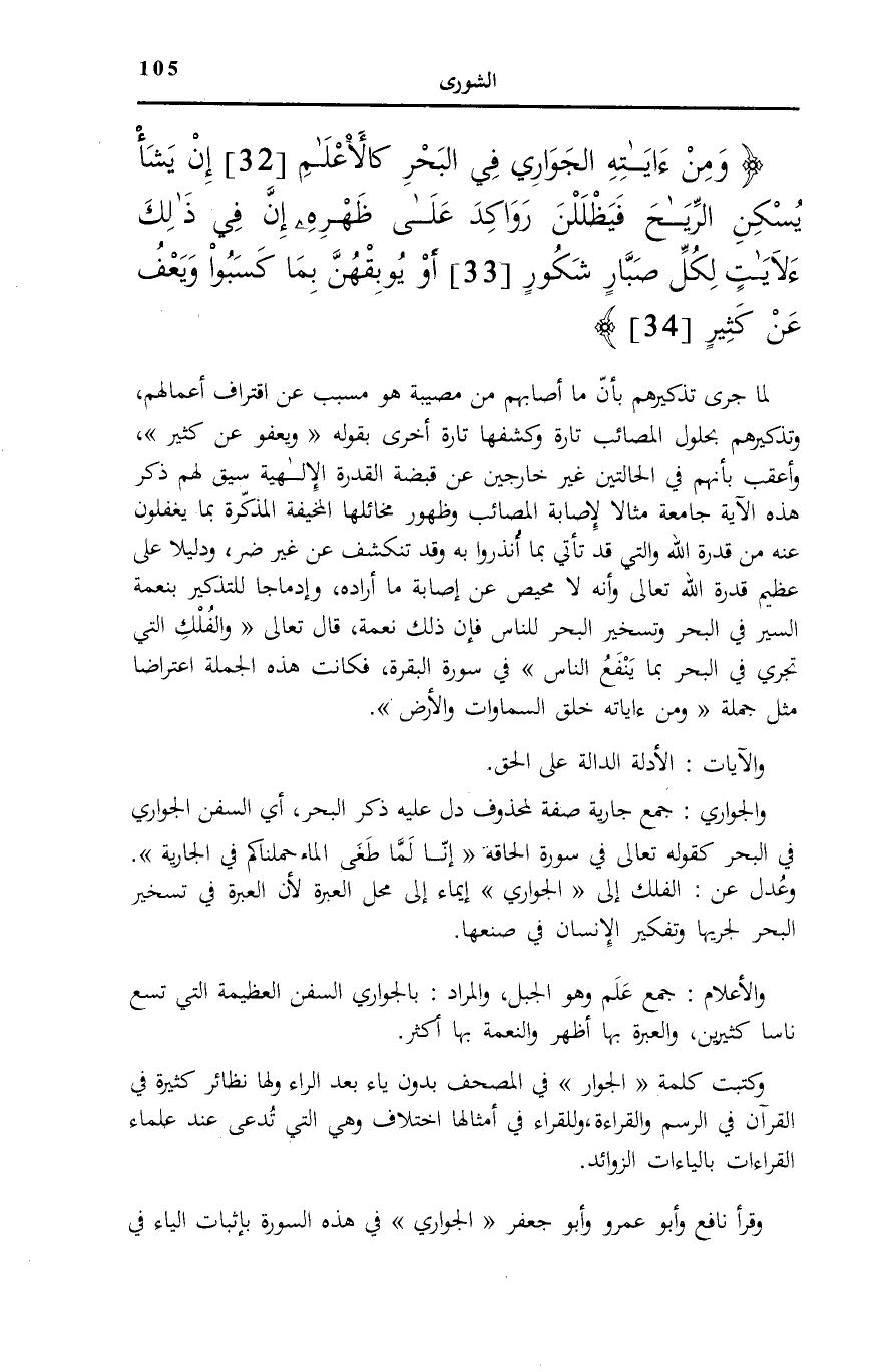 وَمِنْ آياتِهِ الْجَوارِ فِي الْبَحْرِ كَالْأَعْلامِ (32) إِنْ يَشَأْ يُسْكِنِ الرِّيحَ فَيَظْلَلْنَ رَواكِدَ عَلى ظَهْرِهِ إِنَّ فِي ذلِكَ لَآياتٍ لِكُلِّ صَبَّارٍ شَكُورٍ (33) أَوْ يُوبِقْهُنَّ بِما كَسَبُوا وَيَعْفُ عَنْ كَثِيرٍ (34)
