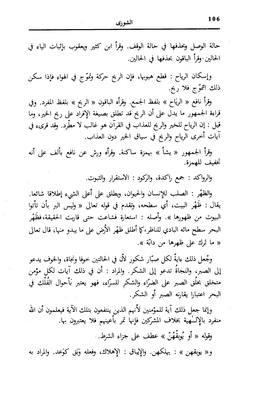 حَالَةِ الْوَصْلِ وَبِحَذْفِهَا فِي حَالَةِ الْوَقْفِ. وَقَرَأَ ابْنُ كَثِيرٍ وَيَعْقُوبُ بِإِثْبَاتِ الْيَاءِ فِي الْحَالَيْنِ. وَقَرَأَ الْبَاقُونَ بِحَذْفِهَا فِي الْحَالَيْنِ.