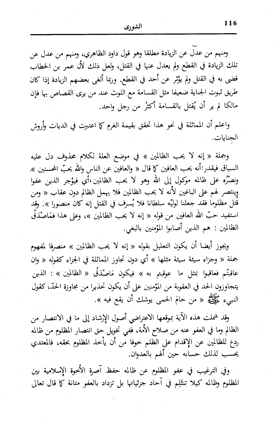 وَيَجُوزُ أَيْضًا أَنْ يَكُونَ التَّعْلِيلُ بَقَوْلِهِ: إِنَّهُ لَا يُحِبُّ الظَّالِمِينَ مُنْصَرِفًا لِمَفْهُومِ جُمْلَةِ وَجَزاءُ سَيِّئَةٍ سَيِّئَةٌ مِثْلُها أَيْ دُونَ تَجَاوُزِ الْمُمَاثَلَةِ فِي الْجَزَاءِ كَقَوْلِهِ: وَإِنْ عاقَبْتُمْ فَعاقِبُوا بِمِثْلِ مَا عُوقِبْتُمْ بِهِ [النَّمْل: 126] فَيكون مَا صدق الظَّالِمِينَ: الَّذِينَ يَتَجَاوَزُونَ الْحَدَّ فِي الْعُقُوبَةِ مِنَ الْمُؤْمِنِينَ عَلَى أَنْ يَكُونَ تَحْذِيرًا مِنْ مُجَاوَزَةِ الْحَدِّ،