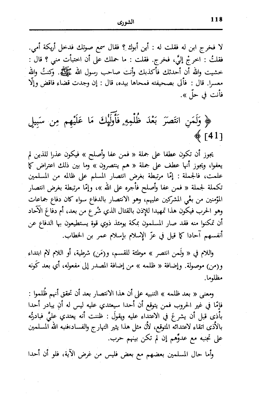يَجُوزُ أَنْ تَكُونَ عَطْفًا عَلَى جُمْلَةِ فَمَنْ عَفا وَأَصْلَحَ [الشورى: 40] فَيَكُونَ عُذْرًا لِلَّذِينِ لَمْ يَعْفُوا، وَيَجُوزُ أَنَّهَا عَطْفٌ عَلَى جُمْلَةِ هُمْ يَنْتَصِرُونَ [الشورى: 39] وَمَا بَيْنَ ذَلِكَ اعْتِرَاضٌ كَمَا عَلِمْتَ، فَالْجُمْلَةُ: إِمَّا مُرْتَبِطَةٌ بِغَرَضِ انْتِصَارِ الْمُسْلِمِ عَلَى ظَالِمِهِ مِنَ الْمُسْلِمِينَ تَكْمِلَةٌ لِجُمْلَةِ فَمَنْ عَفا وَأَصْلَحَ فَأَجْرُهُ عَلَى اللَّهِ [الشورى: 40] ، وَإِمَّا مُرْتَبِطَةٌ بِغَرَضِ انْتِصَارِ الْمُؤْمِنِينَ مِنْ بَغْيِ الْمُشْرِكِينَ عَلَيْهِمْ، وَهُوَ الِانْتِصَارُ بِالدِّفَاعِ سَوَاءٌ كَانَ دِفَاعَ جَمَاعَاتٍ وَهُوَ الْحَرْبُ فَيَكُونَ هَذَا تَمْهِيدًا لِلْإِذْنِ بِالْقِتَالِ الَّذِي شُرِّعَ مِنْ بَعْدُ، أَمْ دِفَاعَ الْآحَادِ إِنْ تَمَكَّنُوا مِنْهُ فَقَدْ صَارَ الْمُسْلِمُونَ بِمَكَّةَ يَوْمَئِذٍ ذَوِي قُوَّةٍ يَسْتَطِيعُونَ بهَا الدّفع عَنْ أَنْفُسِهِمْ آحَادًا كَمَا قِيلَ فِي عِزِّ الْإِسْلَامِ عُمَرَ بْنِ الْخَطَّابِ.