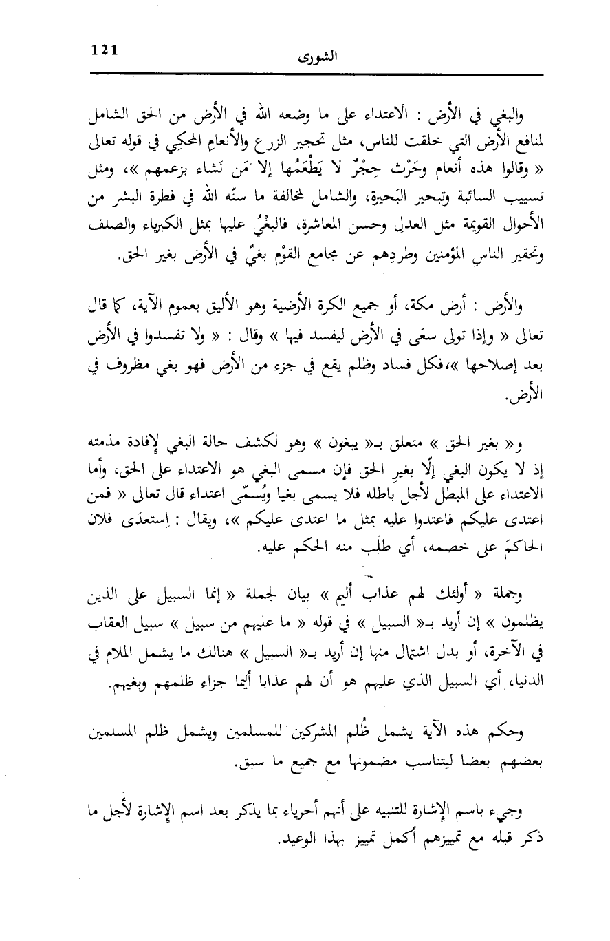 وَجُمْلَةُ أُولئِكَ لَهُمْ عَذابٌ أَلِيمٌ بَيَان جملَة إِنَّمَا السَّبِيلُ عَلَى الَّذِينَ يَظْلِمُونَ إِنْ أُرِيدَ بِ السَّبِيلُ فِي قَوْلِهِ: مَا عَلَيْهِمْ مِنْ سَبِيلٍ [الشورى: 41] سَبِيلٍ الْعِقَابِ فِي الْآخِرَةِ، أَوْ بَدَلُ اشْتِمَالٍ مِنْهَا إِنْ أُرِيدَ بِ السَّبِيلُ هُنَالِكَ مَا يَشْمَلُ الْمَلَامَ فِي الدُّنْيَا، أَيِ السَّبِيلُ الَّذِي عَلَيْهِمْ هُوَ أَنَّ لَهُمْ عَذَابًا أَلِيمًا جَزَاءَ ظُلْمِهِمْ وَبَغْيِهِمْ.