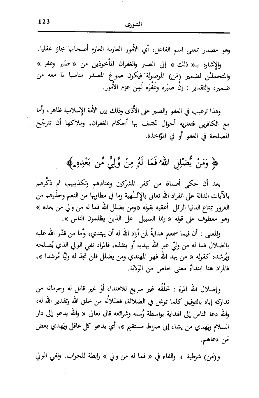 بَعْدَ أَنْ حَكَى أَصْنَافًا مِنْ كُفْرِ الْمُشْرِكِينَ، وَعِنَادِهِمْ وَتَكْذِيبِهِمْ، ثُمَّ ذَكَّرَهُمْ بِالْآيَاتِ الدَّالَّةِ عَلَى انْفِرَادِ اللَّهِ تَعَالَى بِالْإِلَهِيَّةِ وَمَا فِي مَطَاوِيهَا مِنَ النِّعَمِ وَحَذَّرَهُمْ مِنَ الْغُرُورِ بِمَتَاعِ الدُّنْيَا الزَّائِلِ أَعْقَبَهُ بَقَوْلِهِ: وَمَنْ يُضْلِلِ اللَّهُ فَما لَهُ مِنْ وَلِيٍّ مِنْ بَعْدِهِ وَهُوَ مَعْطُوفٌ عَلَى قَوْلِهِ: إِنَّمَا السَّبِيلُ عَلَى الَّذِينَ يَظْلِمُونَ النَّاسَ [الشورى: 42] .