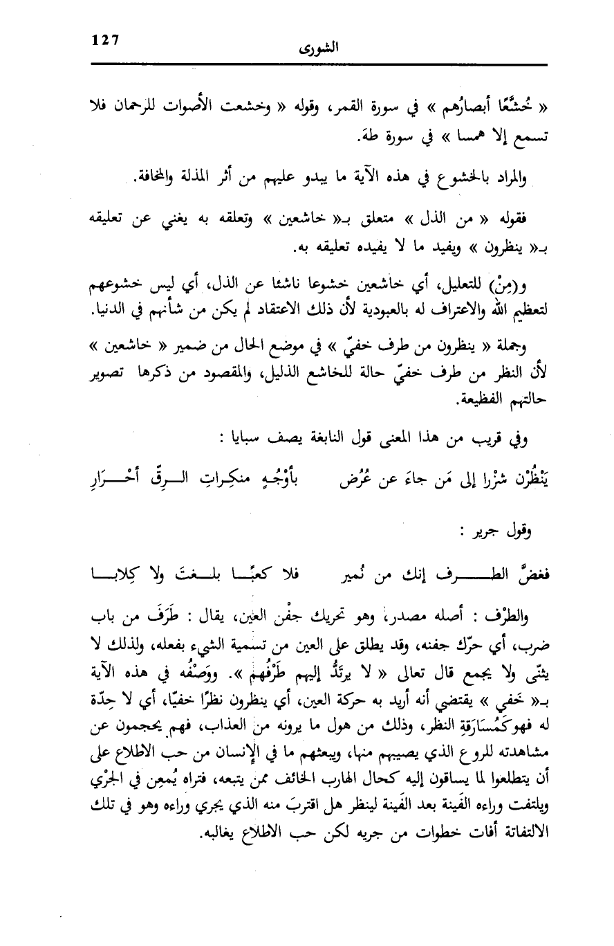 وَالطَّرْفُ: أَصْلُهُ مَصْدَرٌ، وَهُوَ تَحْرِيكُ جَفْنِ الْعَيْنِ، يُقَالُ: طَرَفَ مِنْ بَابِ ضَرَبَ، أَيْ حَرَّكَ جَفْنَهُ، وَقَدْ يُطْلَقُ عَلَى الْعَيْنِ مِنْ تَسْمِيَةِ الشَّيْءِ بِفِعْلِهِ، وَلِذَلِكَ لَا يُثَنَّى وَلَا يُجْمَعُ قَالَ تَعَالَى: لَا يَرْتَدُّ إِلَيْهِمْ طَرْفُهُمْ [إِبْرَاهِيم: 43] . وَوَصْفُهُ فِي هَذِهِ الْآيَةِ بِ خَفِيٍّ يَقْتَضِي أَنَّهُ أُرِيدَ بِهِ حَرَكَةُ الْعَيْنِ، أَيْ يَنْظُرُونَ نَظَرًا خَفِيًّا، أَيْ لَا حِدَّةَ لَهُ فَهُوَ كَمُسَارَقَةِ النَّظَرِ، وَذَلِكَ مِنْ هَوْلِ مَا يَرَوْنَهُ مِنَ الْعَذَابِ، فَهُمْ يُحْجِمُونَ عَنْ مُشَاهَدَتِهِ لِلرَّوْعِ الَّذِي يُصِيبُهُمْ مِنْهَا، وَيَبْعَثُهُمْ مَا فِي الْإِنْسَانِ مِنْ حُبِّ الِاطِّلَاعِ عَلَى أَنْ يَتَطَلَّعُوا لِمَا يُسَاقُونَ إِلَيْهِ كَحَالِ الْهَارِبِ الْخَائِفِ مِمَّنْ يَتْبَعُهُ، فَتَرَاهُ يُمْعِنُ فِي الْجَرْيِ وَيَلْتَفِتُ وَرَاءَهُ الْفَيْنَةَ بَعْدَ الْفَيْنَةِ لِيَنْظُرَ هَلِ اقْتَرَبَ مِنْهُ الَّذِي يَجْرِي وَرَاءَهُ وَهُوَ فِي تِلْكَ الِالْتِفَاتَةِ أَفَاتَ خُطُوَاتٍ مِنْ جَرْيِهِ لَكِنَّ حُبَّ الِاطِّلَاعِ يُغَالِبُهُ.