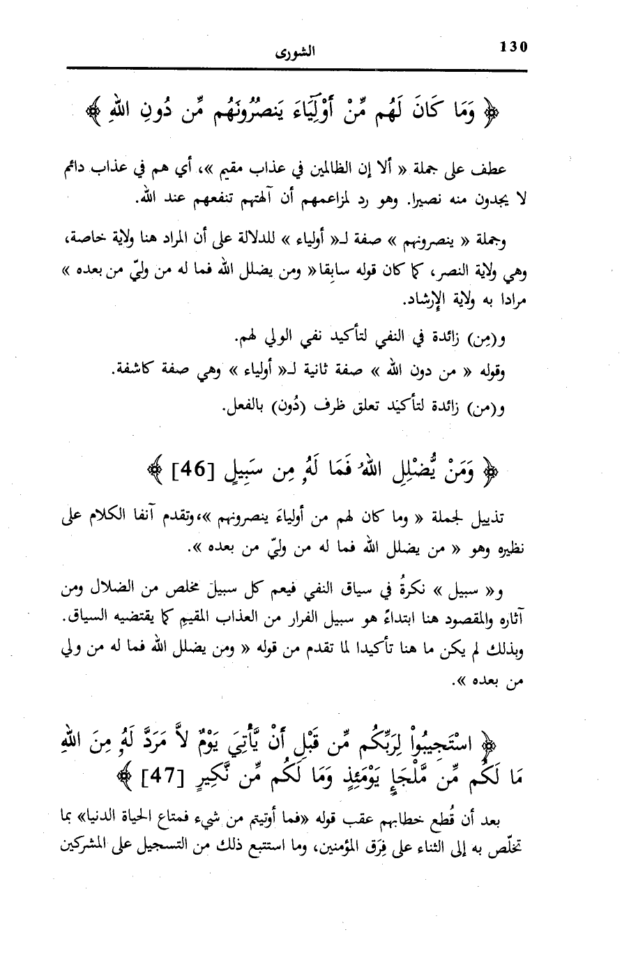 عَطْفٌ عَلَى جُمْلَةِ أَلا إِنَّ الظَّالِمِينَ فِي عَذابٍ مُقِيمٍ [الشورى: 45] أَيْ هُمْ فِي عَذَابٍ دَائِمٍ لَا يَجِدُونَ مِنْهُ نَصِيرًا. وَهُوَ رَدٌّ لِمَزَاعِمِهِمْ أَنَّ آلِهَتَهُمْ تَنْفَعُهُمْ عِنْدَ اللَّهِ.