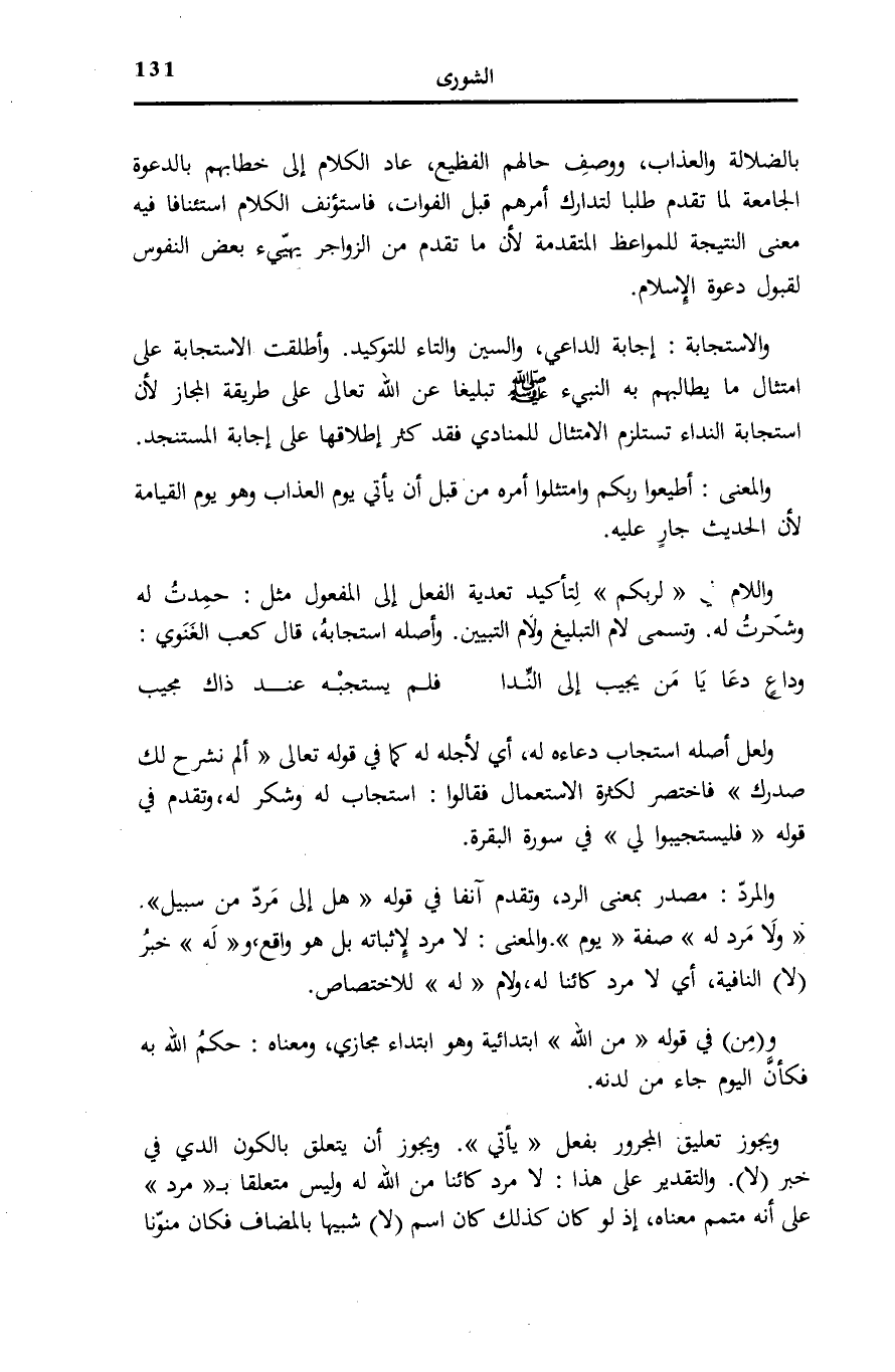 وَالِاسْتِجَابَةُ: إِجَابَةُ الدَّاعِي، وَالسِّينُ وَالتَّاءُ لِلتَّوْكِيدِ. وَأُطْلِقَتْ الِاسْتِجَابَةُ عَلَى امْتِثَالِ مَا يُطَالِبُهُمْ بِهِ النبيء صَلَّى اللهُ عَلَيْهِ وَسَلَّمَ تَبْلِيغًا عَنِ اللَّهِ تَعَالَى عَلَى طَرِيقَةِ الْمَجَازِ لِأَنَّ اسْتِجَابَةَ النِّدَاءِ تَسْتَلْزِمُ الِامْتِثَالَ لِلْمُنَادِي فَقَدْ كَثُرَ إِطْلَاقُهَا عَلَى إِجَابَةِ الْمُسْتَنْجِدِ. وَالْمَعْنَى: أَطِيعُوا رَبَّكُمْ وَامْتَثِلُوا أَمْرَهُ مِنْ قَبْلِ أَنْ يَأْتِيَ يَوْمُ الْعَذَابِ وَهُوَ يَوْمُ الْقِيَامَةِ لِأَنَّ الْحَدِيثَ جَارٍ عَلَيْهِ.