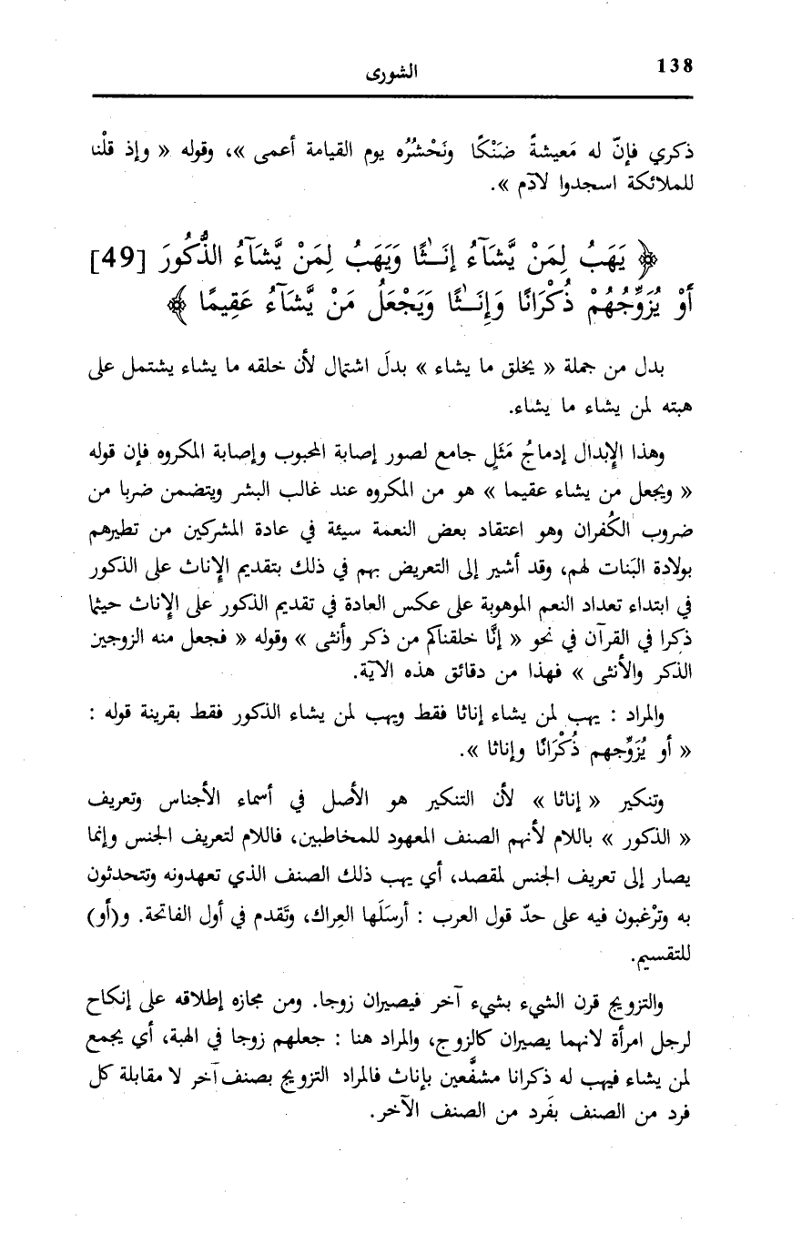 وَالْمُرَادُ: يَهَبُ لِمَنْ يَشَاءُ إِنَاثًا فَقَطْ وَيَهَبُ لِمَنْ يَشَاءُ الذُّكُورَ فَقَطْ بِقَرِينَةِ قَوْلِهِ: أَوْ يُزَوِّجُهُمْ ذُكْراناً وَإِناثاً. وَتَنْكِيرُ إِناثاً لِأَنَّ التَّنْكِيرَ هُوَ الْأَصْلُ فِي أَسْمَاءِ الْأَجْنَاسِ وَتَعْرِيفُ الذُّكُورَ بِاللَّامِ لِأَنَّهُمُ الصِّنْفُ الْمَعْهُودُ لِلْمُخَاطَبِينَ، فَاللَّامُ لِتَعْرِيفِ الْجِنْسِ وَإِنَّمَا يُصَارُ إِلَى تَعْرِيفِ الْجِنْسِ لِمَقْصِدٍ، أَيْ يَهَبُ ذَلِكَ الصِّنْفَ الَّذِي تَعْهَدُونَهُ وَتَتَحَدَّثُونَ بِهِ وَتَرْغَبُونَ فِيهِ عَلَى حَدِّ قَوْلِ الْعَرَبِ: أَرْسَلَهَا الْعِرَاكُ، وَتَقَدَّمَ فِي أَوَّلِ الْفَاتِحَةِ. وأَوْ لِلتَّقْسِيمِ.
