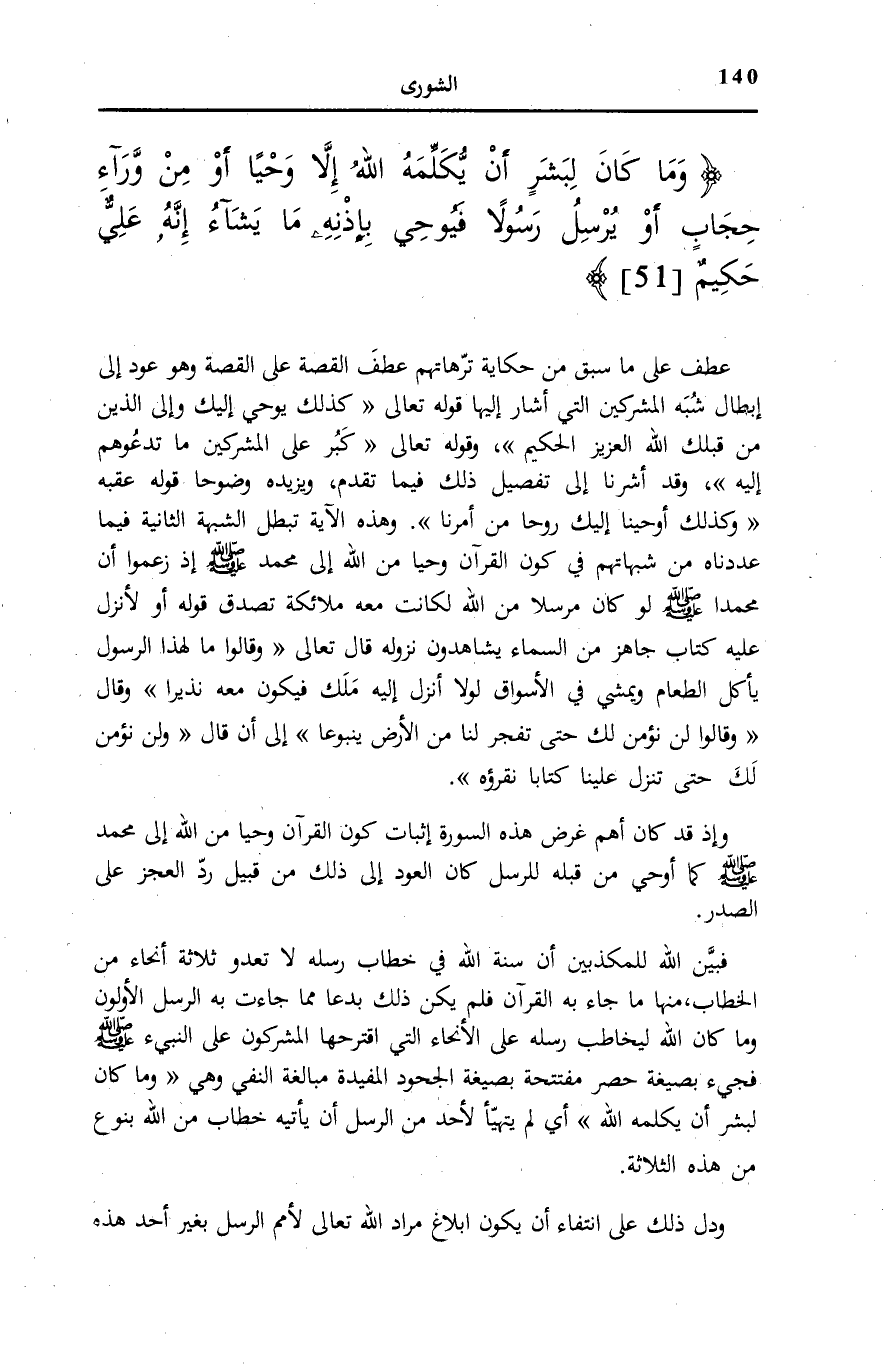 وَإِذْ قَدْ كَانَ أَهَمَّ غَرَضِ هَذِهِ السُّورَةِ إِثْبَاتَ كَوْنِ الْقُرْآنِ وَحْيًا مِنَ اللَّهِ إِلَى مُحَمَّد صَلَّى اللهُ عَلَيْهِ وَسَلَّمَ كَمَا أُوحِيَ مِنْ قَبْلِهِ لِلرُّسُلِ كَانَ الْعَوْدُ إِلَى ذَلِكَ مِنْ قَبِيلِ رَدِّ الْعَجُزِ عَلَى الصَّدْرِ. فَبَيَّنَ اللَّهُ لِلْمُكَذِّبِينَ أَنَّ سُنَّةَ اللَّهِ فِي خِطَابِ رُسُلِهِ لَا تَعْدُو ثَلَاثَةَ أَنْحَاءٍ مِنَ الْخِطَابِ، مِنْهَا مَا جَاءَ بِهِ الْقُرْآنُ فَلَمْ يَكُنْ ذَلِكَ بِدَعًا مِمَّا جَاءَتْ بِهِ الرُّسُلُ الْأَوَّلُونَ وَمَا كَانَ اللَّهُ لِيُخَاطِبَ رُسُلَهُ عَلَى الْأَنْحَاءِ الَّتِي اقْتَرَحَهَا الْمُشْرِكُونَ على النبيء صَلَّى اللهُ عَلَيْهِ وَسَلَّمَ فَجِيءَ بِصِيغَةِ حَصْرٍ مُفْتَتَحَةٍ بِصِيغَةِ الْجُحُودِ الْمُفِيدَةِ مُبَالَغَةَ النَّفْيِ وَهِيَ وَما كانَ لِبَشَرٍ أَنْ يُكَلِّمَهُ اللَّهُ أَيْ لَمْ يَتَهَيَّأْ لِأَحَدٍ مِنَ الرُّسُلِ أَنْ يَأْتِيَهُ خِطَابٌ مِنَ اللَّهِ بِنَوْعٍ مِنْ هَذِهِ الثَّلَاثَةِ.