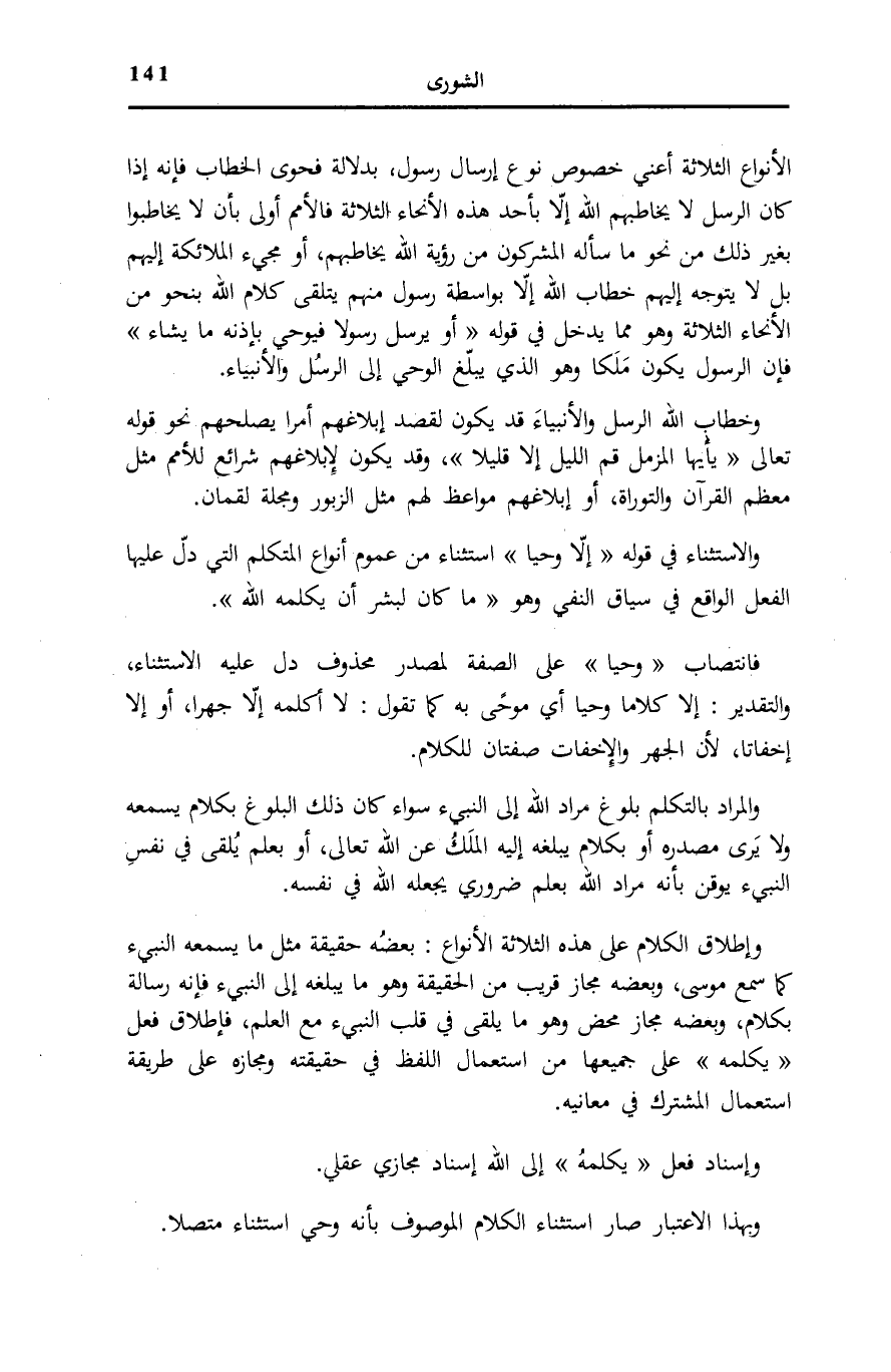 الْأَنْوَاعِ الثَّلَاثَةِ أَعْنِي خُصُوصَ نَوْعِ إِرْسَالِ رَسُولٍ بِدَلَالَةِ فَحْوَى الْخِطَابِ فَإِنَّهُ إِذَا كَانَ الرُّسُلُ لَا يُخَاطِبُهُمُ اللَّهُ إِلَّا بِأَحَدِ هَذِهِ الْأَنْحَاءِ الثَّلَاثَةِ فَالْأُمَمُ أَوْلَى بِأَنْ لَا يُخَاطَبُوا بِغَيْرِ ذَلِكَ مِنْ نَحْوِ مَا سَأَلَهُ الْمُشْرِكُونَ مِنْ رُؤْيَةِ اللَّهِ يُخَاطِبُهُمْ، أَوْ مَجِيءِ الْمَلَائِكَةِ إِلَيْهِمْ بَلْ لَا يَتَوَجَّهُ إِلَيْهِمْ خِطَابُ اللَّهِ إِلَّا بِوَاسِطَةِ رَسُولٍ مِنْهُمْ يَتَلَقَّى كَلَامَ اللَّهِ بِنَحْوٍ مِنَ الْأَنْحَاءِ الثَّلَاثَةِ وَهُوَ مِمَّا يَدْخُلُ فِي قَوْلِهِ: أَوْ يُرْسِلَ رَسُولًا فَيُوحِيَ بِإِذْنِهِ مَا يَشاءُ فَإِنَّ الرَّسُولَ يَكُونُ مَلِكًا وَهُوَ الَّذِي يُبَلِّغُ الْوَحْيَ إِلَى الرُّسُلِ وَالْأَنْبِيَاءِ.