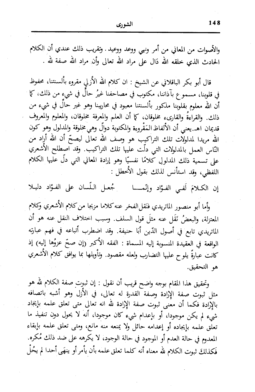 قَالَ أَبُو بَكْرٍ الْبَاقِلَّانِيُّ عَنِ الشَّيْخِ: إِنَّ كَلَامَ اللَّهِ الْأَزَلِيَّ مَقْرُوءٌ بِأَلْسِنَتِنَا، مَحْفُوظٌ فِي قُلُوبِنَا، مَسْمُوعٌ بِآذَانِنَا، مَكْتُوبٌ فِي مَصَاحِفِنَا غَيْرَ حَالٍّ فِي شَيْءٍ مِنْ ذَلِكَ، كَمَا أَنَّ اللَّهَ مَعْلُومٌ بِقُلُوبِنَا مَذْكُورٌ بِأَلْسِنَتِنَا مَعْبُودٌ فِي مَحَارِيبِنَا وَهُوَ غَيْرُ حَالٍّ فِي شَيْءٍ مِنْ ذَلِكَ. وَالْقِرَاءَةُ وَالْقَارِئُ مَخْلُوقَانِ، كَمَا أَنَّ الْعِلْمَ وَالْمَعْرِفَةَ مَخْلُوقَانِ، وَالْمَعْلُومُ وَالْمَعْرُوفُ قَدِيمَانِ اهـ.