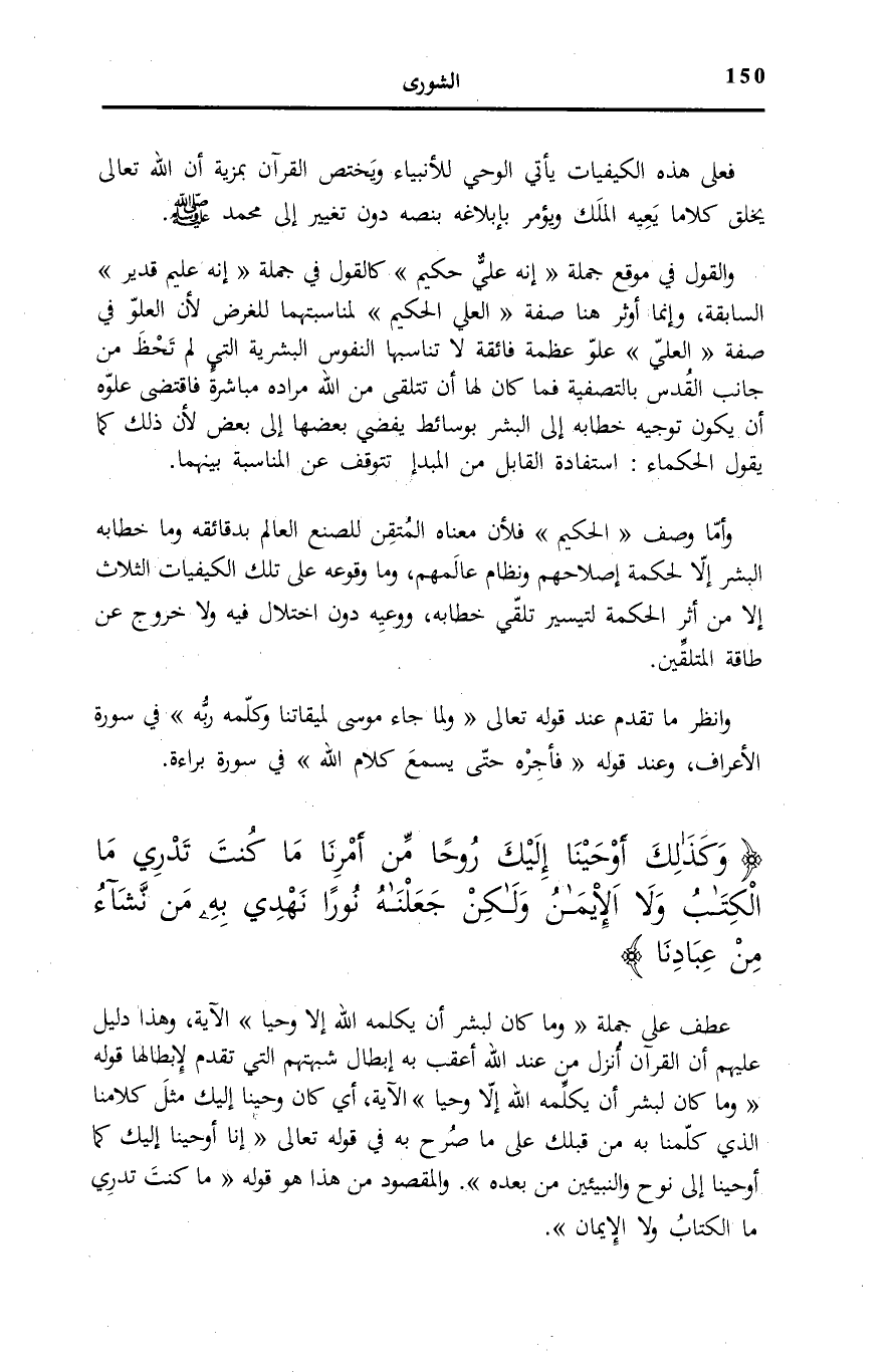 وَالْقَوْلُ فِي مَوْقِعِ جُمْلَةِ إِنَّهُ عَلِيٌّ حَكِيمٌ كَالْقَوْلِ فِي جُمْلَةِ إِنَّهُ عَلِيمٌ قَدِيرٌ [الشورى: 50] السَّابِقَةِ، وَإِنَّمَا أُوثِرَ هُنَا صِفَةُ الْعَلِيِّ الْحَكِيمِ لِمُنَاسَبَتِهِمَا لِلْغَرَضِ لِأَنَّ الْعُلُوَّ فِي صِفَةِ الْعَلِيِّ عُلُوُّ عَظَمَةٍ فَائِقَةٍ لَا تُنَاسِبُهَا النُّفُوسُ الْبَشَرِيَّةُ الَّتِي لَمْ تَحْظَ مِنْ جَانِبِ الْقُدْسِ بِالتَّصْفِيَةِ فَمَا كَانَ لَهَا أَنْ تَتَلَقَّى مِنَ اللَّهِ مُرَادَهُ مُبَاشَرَةً فَاقْتَضَى عُلُوُّهُ أَنْ يَكُونَ تَوْجِيهُ خِطَابِهِ إِلَى الْبَشَرِ بِوَسَائِطَ يُفْضِي بَعْضُهَا إِلَى بَعْضٍ لِأَنَّ ذَلِكَ كَمَا يَقُولُ الْحُكَمَاءُ: اسْتِفَادَةُ الْقَابِلِ مِنَ الْمَبْدَأِ تَتَوَقَّفُ عَنِ الْمُنَاسَبَةِ بَيْنَهُمَا. وَأَمَّا وَصْفُ الْحَكِيمِ فَلِأَنَّ مَعْنَاهُ الْمُتْقِنُ لِلصُّنْعِ الْعَالِمُ بِدَقَائِقِهِ وَمَا خِطَابُهُ الْبَشَرَ إِلَّا لِحِكْمَةِ إِصْلَاحِهِمْ وَنِظَامِ عَالَمِهِمْ، وَمَا وُقُوعُهُ عَلَى تِلْكَ الْكَيْفِيَّاتِ الثَّلَاثِ إِلَّا مِنْ أَثَرِ الْحِكْمَةِ لِتَيْسِيرِ تَلَقِّي خِطَابِهِ، وَوَعْيِهِ دُونَ اخْتِلَالٍ فِيهِ وَلَا خُرُوجٍ عَنْ طَاقَةِ الْمُتَلَقِّينَ.