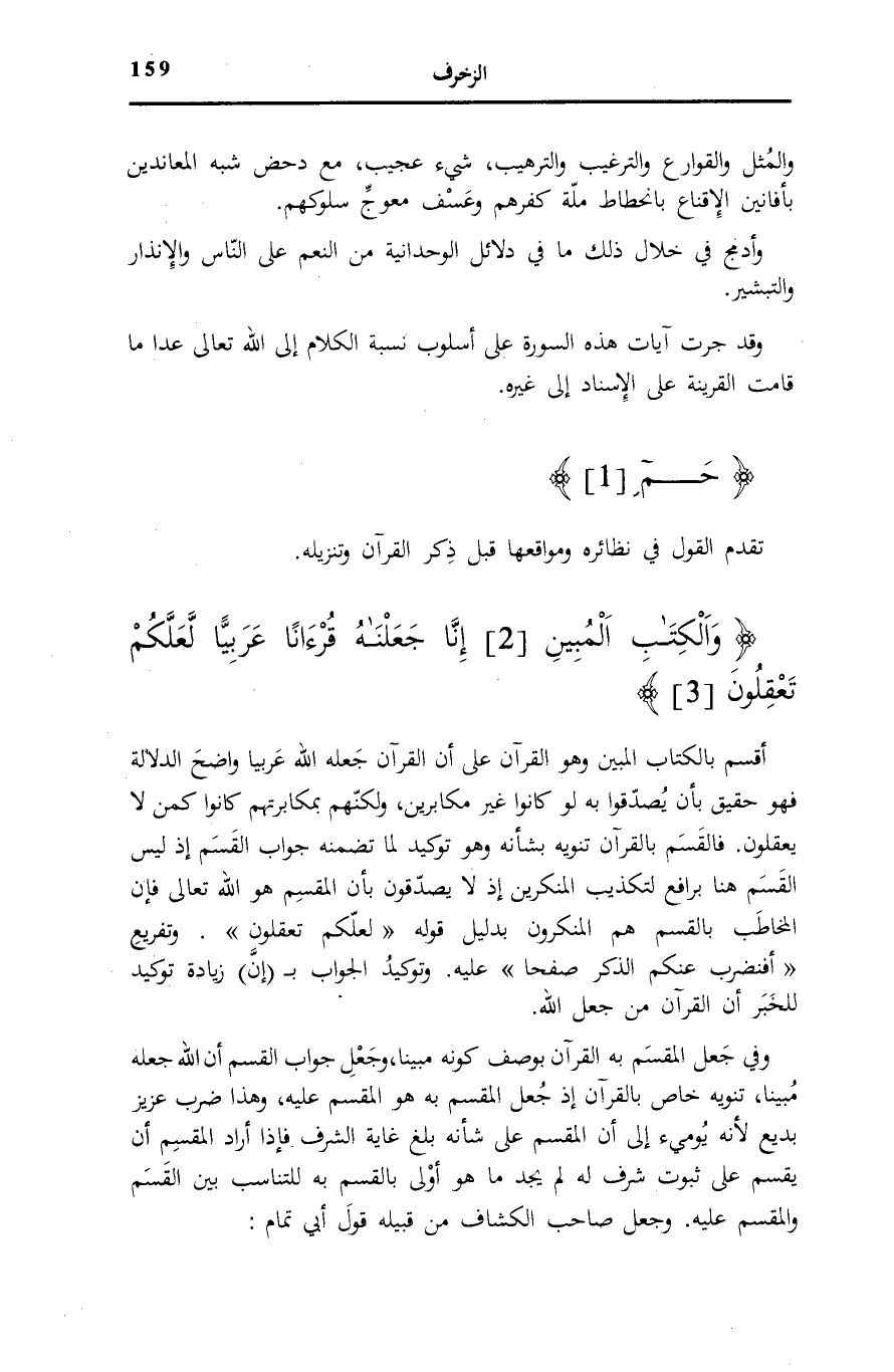 فَالْقَسَمُ بِالْقُرْآنِ تَنْوِيهٌ بِشَأْنِهِ وَهُوَ تَوْكِيدٌ لِمَا تَضَمَّنَهُ جَوَابُ الْقَسَمِ إِذْ لَيْسَ الْقَسَمُ هُنَا بِرَافِعٍ لِتَكْذِيبِ الْمُنْكِرِينَ إِذْ لَا يُصَدِّقُونَ بِأَنَّ الْمُقْسِمَ هُوَ اللَّهُ تَعَالَى فَإِنَّ الْمُخَاطَبَ بِالْقَسَمِ هُمُ الْمُنْكِرُونَ بِدَلِيلِ قَوْلِهِ: لَعَلَّكُمْ تَعْقِلُونَ وَتَفْرِيعِ أَفَنَضْرِبُ عَنْكُمُ الذِّكْرَ صَفْحاً [الزخرف: 5] عَلَيْهِ. وَتَوْكِيدُ الْجَوَابِ بِ (إِنَّ) زِيَادَةُ تَوْكِيدٍ لِلْخَبَرِ أَنَّ الْقُرْآنَ مِنْ جَعْلِ اللَّهِ.