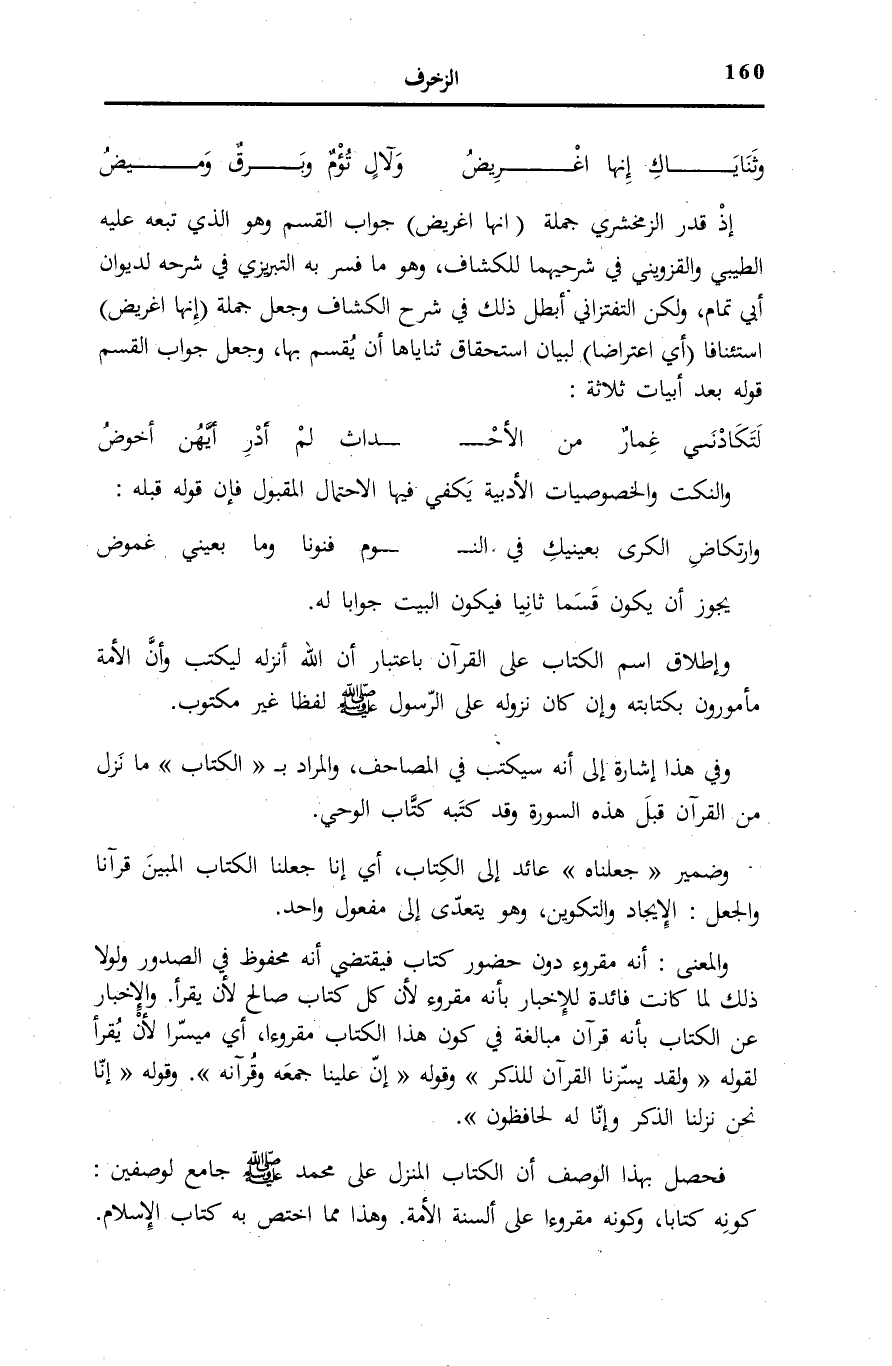فَحَصَلَ بِهَذَا الْوَصْفِ أَنَّ الْكِتَابَ الْمُنَزَّلَ على مُحَمَّد صَلَّى اللهُ عَلَيْهِ وَسَلَّمَ جَامِعٌ لِوَصْفَيْنِ: كَوْنِهِ كِتَابًا، وَكَوْنِهِ مَقْرُوءًا عَلَى أَلْسِنَةِ الْأُمَّةِ. وَهَذَا مِمَّا اخْتُصَّ بِهِ كِتَابُ الْإِسْلَامِ.