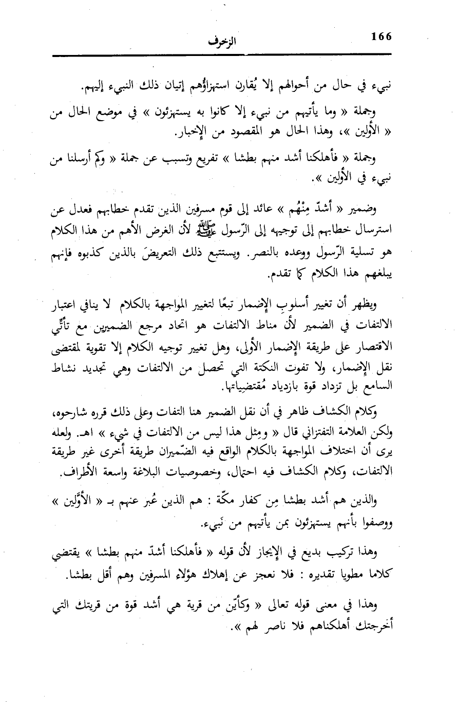 وَكَلَامُ «الْكَشَّافِ» ظَاهِرٌ فِي أَنَّ نَقْلَ الضَّمِيرِ هُنَا الْتِفَاتٌ وَعَلَى ذَلِكَ قَرَّرَهُ شَارِحُوهُ، وَلَكِن الْعَلامَة التفتازانيّ قَالَ: وَمِثْلُ هَذَا لَيْسَ مِنْ الِالْتِفَاتِ فِي شَيْءٍ اهـ. وَلَعَلَّهُ يَرَى أَنَّ اخْتِلَافَ الْمُوَاجَهَةِ بِالْكَلَامِ الْوَاقِعِ فِيهِ الضَّمِيرَانِ طَرِيقَةٌ أُخْرَى غَيْرُ طَرِيقَةِ الِالْتِفَاتِ، وَكَلَامُ «الْكَشَّافِ» فِيهِ احْتِمَالٌ، وَخُصُوصِيَّاتُ الْبَلَاغَةِ وَاسِعَةُ الْأَطْرَافِ. وَالَّذِينَ هُمْ أَشَدُّ بَطْشًا مِنْ كُفَّارِ مَكَّةَ: هُمُ الَّذِينَ عَبَّرَ عَنْهُمْ بِ الْأَوَّلِينَ وَوُصِفُوا بِأَنَّهُمْ يَسْتَهْزِئُونَ بِمَنْ يَأْتِيهم من نبيء. وَهَذَا تَرْتِيب بَدِيعٌ فِي الْإِيجَازِ لِأَنَّ قَوْلَهُ: فَأَهْلَكْنا أَشَدَّ مِنْهُمْ بَطْشاً يَقْتَضِي كَلَامًا مَطْوِيًّا تَقْدِيرُهُ: فَلَا نَعْجِزُ عَن إهلاك هَؤُلَاءِ الْمُسْرِفِينَ وَهُمْ أَقَلُّ بَطْشًا.