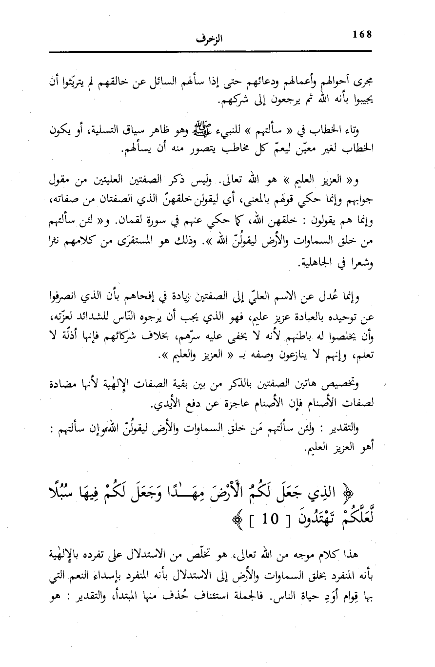 والْعَزِيزُ الْعَلِيمُ هُوَ اللَّهُ تَعَالَى. وَلَيْسَ ذِكْرُ الصِّفَتَيْنِ الْعَلِيَّتَيْنِ مِنْ مَقُولِ جَوَابِهِمْ وَإِنَّمَا حُكِيَ قَوْلُهُمْ بِالْمَعْنَى، أَيْ لَيَقُولُنَّ خَلْقَهُنَّ الَّذِي الصِّفَتَانِ مِنْ صِفَاتِهِ، وَإِنَّمَا هُمْ يَقُولُونَ: خَلَقَهُنَّ اللَّهُ، كَمَا حُكِيَ عَنْهُمْ فِي سُورَةِ لُقْمَانَ [25] ولَئِنْ سَأَلْتَهُمْ مَنْ خَلَقَ السَّماواتِ وَالْأَرْضَ لَيَقُولُنَّ اللَّهُ. وَذَلِكَ هُوَ المستقرى مِنْ كَلَامِهِمْ نَثْرًا وَشِعْرًا فِي الْجَاهِلِيَّةِ. وَإِنَّمَا عدل عَن اسْم الْعَلِيِّ إِلَى الصِّفَتَيْنِ زِيَادَةً فِي إِفْحَامِهِمْ بِأَنَّ الَّذِي انْصَرَفُوا عَنْ تَوْحِيدِهِ بِالْعِبَادَةِ عَزِيزٌ عَلِيمٌ، فَهُوَ الَّذِي يَجِبُ أَنْ يَرْجُوَهُ النَّاسُ لِلشَّدَائِدِ لِعِزَّتِهِ وَأَنْ يُخْلِصُوا لَهُ بَاطِنَهُمْ لِأَنَّهُ لَا يَخْفَى عَلَيْهِ سِرُّهُمْ، بِخِلَافِ شُرَكَائِهِمْ فَإِنَّهَا أَذِلَّةٌ لَا تَعْلَمُ، وَإِنَّهُمْ لَا يُنَازَعُونَ وَصْفَهُ بِ الْعَزِيزُ الْعَلِيمُ.