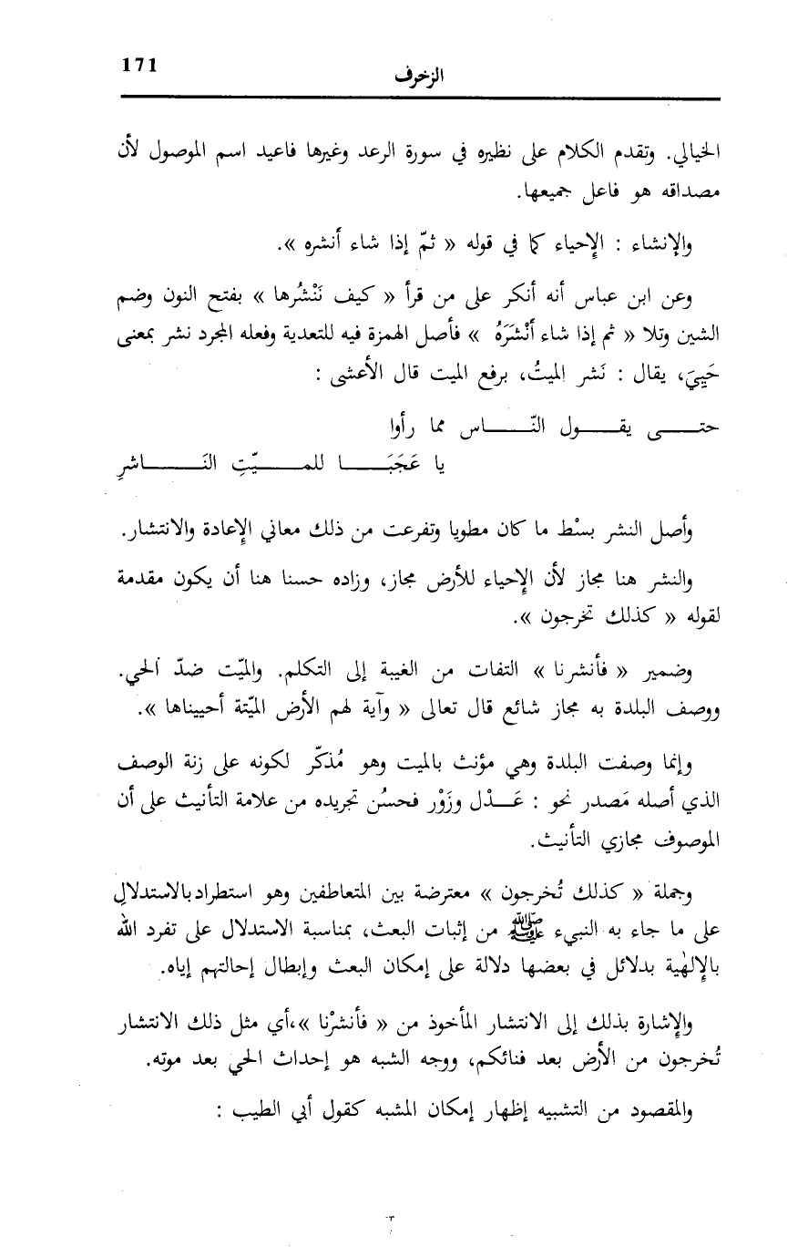وَالنَّشْرُ هُنَا مَجَازٌ لِأَنَّ الْإِحْيَاءَ لِلْأَرْضِ مَجَازٌ، وَزَادَهُ حُسْنًا هُنَا أَنْ يَكُونَ مُقَدِّمَةً لِقَوْلِهِ: كَذلِكَ تُخْرَجُونَ.