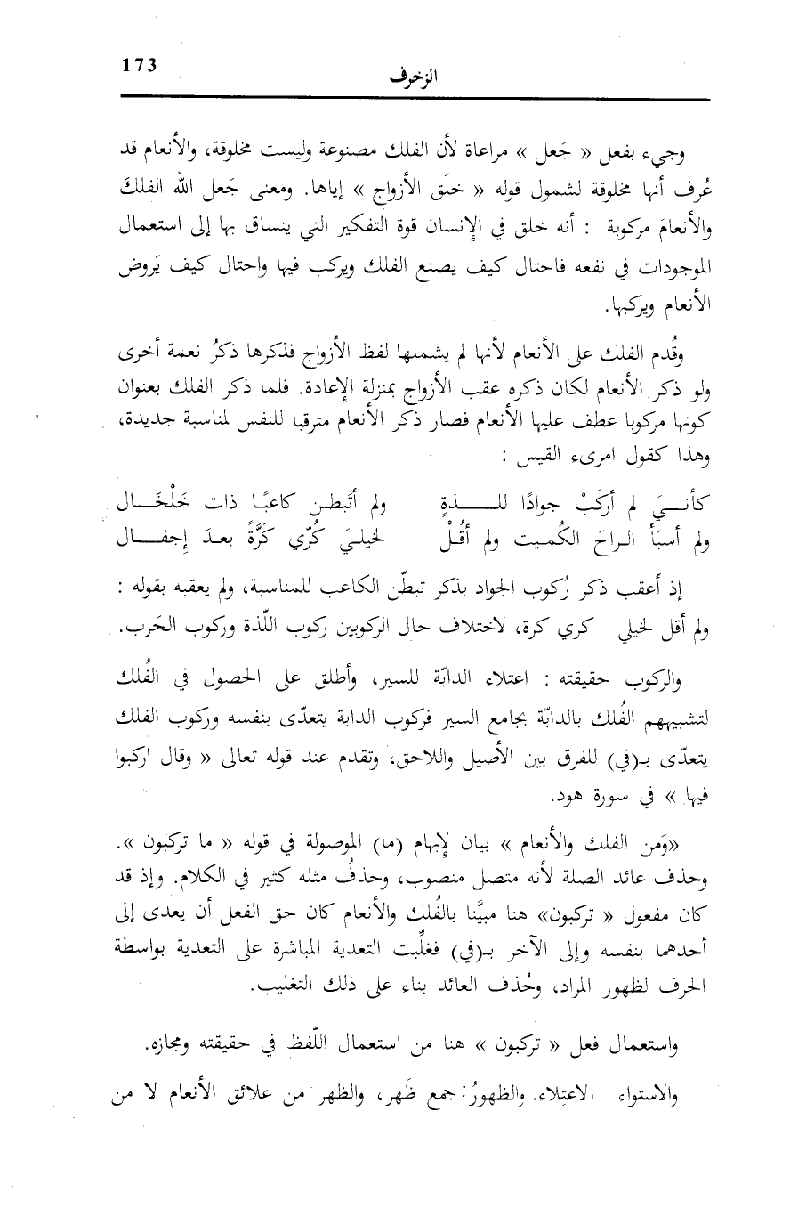 وَجِيءَ بِفِعْلِ جَعَلَ مُرَاعَاةً لِأَنَّ الْفُلْكَ مَصْنُوعَةٌ وَلَيْسَتْ مَخْلُوقَةً، وَالْأَنْعَامُ قَدْ عُرِفَ أَنَّهَا مَخْلُوقَةٌ لِشُمُولِ قَوْلِهِ: خَلَقَ الْأَزْواجَ إِيَّاهَا. وَمَعْنَى جَعْلِ اللَّهُ الْفُلْكَ وَالْأَنْعَامَ مَرْكُوبَةً: أَنَّهُ خَلَقَ فِي الْإِنْسَانِ قُوَّةَ التَّفْكِيرِ الَّتِي يَنْسَاقُ بِهَا إِلَى اسْتِعْمَالِ الْمَوْجُودَاتِ فِي نَفْعِهِ فَاحْتَالَ كَيْفَ يَصْنَعُ الْفُلْكَ وَيَرْكَبُ فِيهَا وَاحْتَالَ كَيْفَ يُرَوِّضُ الْأَنْعَامَ وَيَرْكَبُهَا.