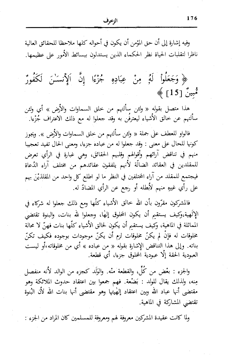وَجَعَلُوا لَهُ مِنْ عِبادِهِ جُزْءاً إِنَّ الْإِنْسانَ لَكَفُورٌ مُبِينٌ (15)