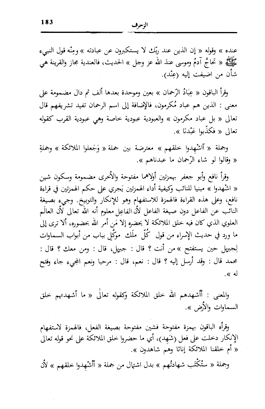 وَجُمْلَة أَشَهِدُوا خَلْقَهُمْ مُعْتَرِضَةٌ بَيْنَ جُمْلَةِ وَجَعَلُوا الْمَلائِكَةَ وَجُمْلَةِ وَقالُوا لَوْ شاءَ الرَّحْمنُ مَا عَبَدْناهُمْ [الزخرف: 20] .