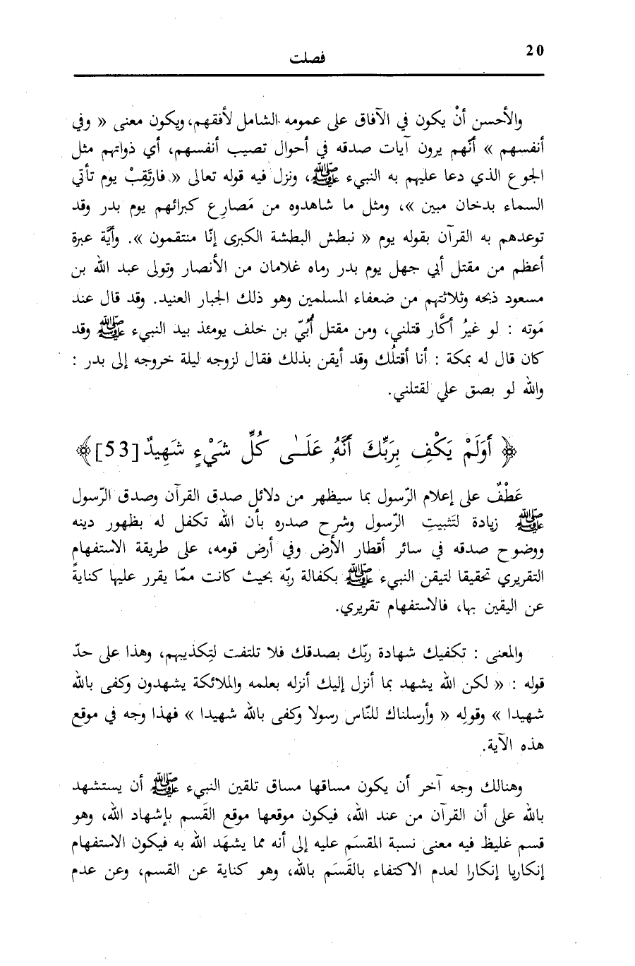 وَالْأَحْسَنُ أَنْ يَكُونَ فِي الْآفَاقِ عَلَى عُمُومِهِ الشَّامِلِ لِأُفُقِهِمْ، وَيَكُونَ مَعْنَى وَفِي أَنْفُسِهِمْ أَنَّهُمْ يَرَوْنَ آيَاتِ صِدْقِهِ فِي أَحْوَالٍ تُصِيبُ أَنْفُسَهُمْ، أَيْ ذَوَاتِهِمْ مِثْلَ الْجُوعِ الَّذِي دَعَا عَلَيْهِمْ بِهِ النبيء صَلَّى اللهُ عَلَيْهِ وَسَلَّمَ، وَنَزَلَ فِيهِ قَوْلُهُ تَعَالَى: فَارْتَقِبْ يَوْمَ تَأْتِي السَّماءُ بِدُخانٍ مُبِينٍ [الدُّخان: 10] ، وَمِثْلَ مَا شَاهَدُوهُ مِنْ مَصَارِعِ كُبَرَائِهِمْ يَوْمَ بَدْرٍ وَقَدْ تَوَعَّدَهُمْ بِهِ الْقُرْآنُ بِقَوْلِهِ يَوْمَ نَبْطِشُ الْبَطْشَةَ الْكُبْرى إِنَّا مُنْتَقِمُونَ [الدُّخان: 16] . وَأَيَّةُ عِبْرَةٍ أَعْظَمُ مِنْ مَقْتَلِ أَبِي جَهْلٍ يَوْمَ بَدْرٍ رَمَاهُ غُلَامَانِ مِنَ الْأَنْصَارِ وَتَوَلَّى عَبْدُ اللَّهِ بْنُ مَسْعُودٍ ذَبْحَهُ وَثَلَاثَتُهُمْ مِنْ ضُعَفَاءِ الْمُسْلِمِينَ وَهُوَ ذَلِكَ الْجَبَّارُ الْعَنِيدُ. وَقَدْ قَالَ عِنْدَ مَوْتِهِ: لَوْ غَيْرَ أَكَّارٍ قَتَلَنِي، وَمِنْ مَقْتَلِ أُبَيِّ بْنِ خَلَفٍ يَوْمَئِذٍ بيد النبيء صَلَّى اللهُ عَلَيْهِ وَسَلَّمَ وَقَدْ كَانَ قَالَ لَهُ بِمَكَّةَ: أَنَا أَقْتُلُكَ وَقَدْ أَيْقَنَ بِذَلِكَ فَقَالَ لِزَوْجِهِ لَيْلَةَ خُرُوجِهِ إِلَى بَدْرٍ: وَاللَّهِ لَوْ بَصَقَ عَلَيَّ لَقَتَلَنِي.