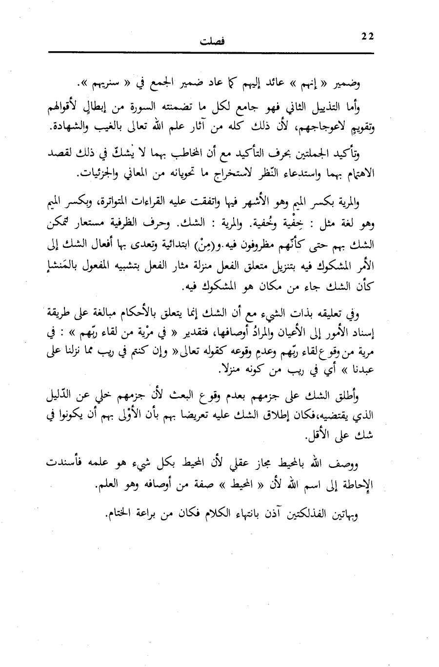 وَفِي تَعْلِيقِهِ بِذَاتِ الشَّيْءِ مَعَ أَنَّ الشَّكَّ إِنَّمَا يَتَعَلَّقُ بِالْأَحْكَامِ مُبَالَغَةٌ عَلَى طَرِيقَةِ إِسْنَادِ الْأُمُورِ إِلَى الْأَعْيَانِ وَالْمُرَادُ أَوْصَافُهَا، فَتَقْدِيرُ فِي مِرْيَةٍ مِنْ لِقاءِ رَبِّهِمْ: فِي مِرْيَةٍ مِنْ وُقُوعِ لِقَاءِ رَبِّهِمْ وَعَدَمِ وُقُوعِهِ كَقَوْلِهِ تَعَالَى: وَإِنْ كُنْتُمْ فِي رَيْبٍ مِمَّا نَزَّلْنا عَلى عَبْدِنا [الْبَقَرَة: 23] أَيْ فِي رَيْبٍ مِنْ كَوْنِهِ مُنَزَّلًا. وَأَطْلَقَ الشَّكَّ عَلَى جَزْمِهِمْ بِعَدَمِ وُقُوعِ الْبَعْثِ لِأَنَّ جَزْمَهُمْ خَلِيٌّ عَنِ الدَّلِيلِ الَّذِي يَقْتَضِيهِ، فَكَانَ إِطْلَاقُ الشَّكِّ عَلَيْهِ تَعْرِيضًا بِهِمْ بِأَنَّ الْأَوْلَى بِهِمْ أَنْ يَكُونُوا فِي شَكٍّ عَلَى الْأَقَلِّ.
