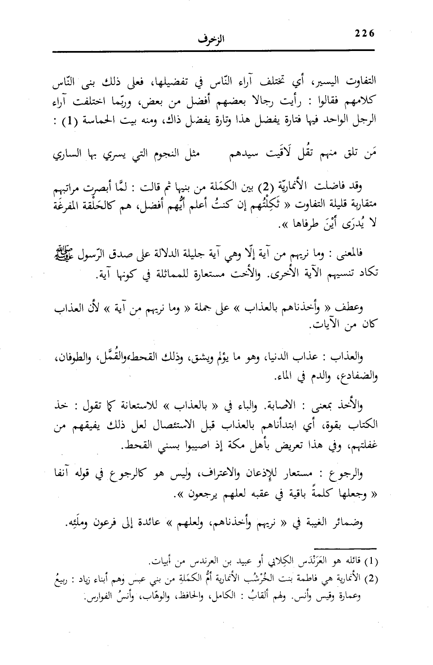 وَقَدْ فَاضَلَتِ الْأَنْمَارِيَّةُ (¬2) بَيْنَ الْكَمَلَةِ مِنْ بَنِيهَا ثُمَّ قَالَتْ لَمَّا أَبْصَرْتُ مَرَاتِبَهُمْ مُتَقَارِبَةً قَلِيلَةَ التَّفَاوُتِ: ثَكِلْتُهُمْ إِنْ كُنْتُ أَعْلَمُ أَيَّهُمْ أَفْضَلُ، هُمْ كَالْحَلْقَةِ الْمُفَرَّغَةِ لَا يُدْرَى أَيْنَ طَرَفَاهَا. فَالْمَعْنَى: وَمَا نُرِيهِمْ مِنْ آيَةٍ إِلَّا وَهِيَ آيَةٌ جَلِيلَةُ الدَّلَالَةِ عَلَى صدق الرّسول صَلَّى اللهُ عَلَيْهِ وَسَلَّمَ تَكَادُ تُنْسِيهِمُ الْآيَةَ الْأُخْرَى. وَالْأُخْتُ مُسْتَعَارَةٌ لِلْمُمَاثَلَةِ فِي كَوْنِهَا آيَةً.