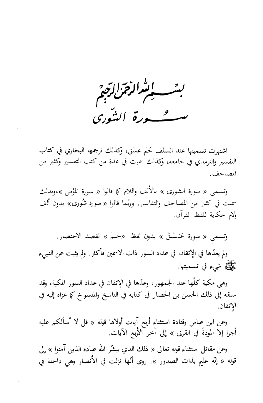 وَتُسَمَّى «سُورَةَ الشُّورَى» بِالْأَلِفِ وَاللَّامِ كَمَا قَالُوا «سُورَةَ الْمُؤْمِنِ» ، وَبِذَلِكَ سُمِّيَتْ فِي كَثِيرٍ مِنَ الْمَصَاحِفِ وَالتَّفَاسِيرِ، وَرُبَّمَا قَالُوا «سُورَةَ شُورَى» بِدُونِ أَلْفٍ وَلَامٍ حِكَايَةً لِلَفْظِ الْقُرْآنِ.