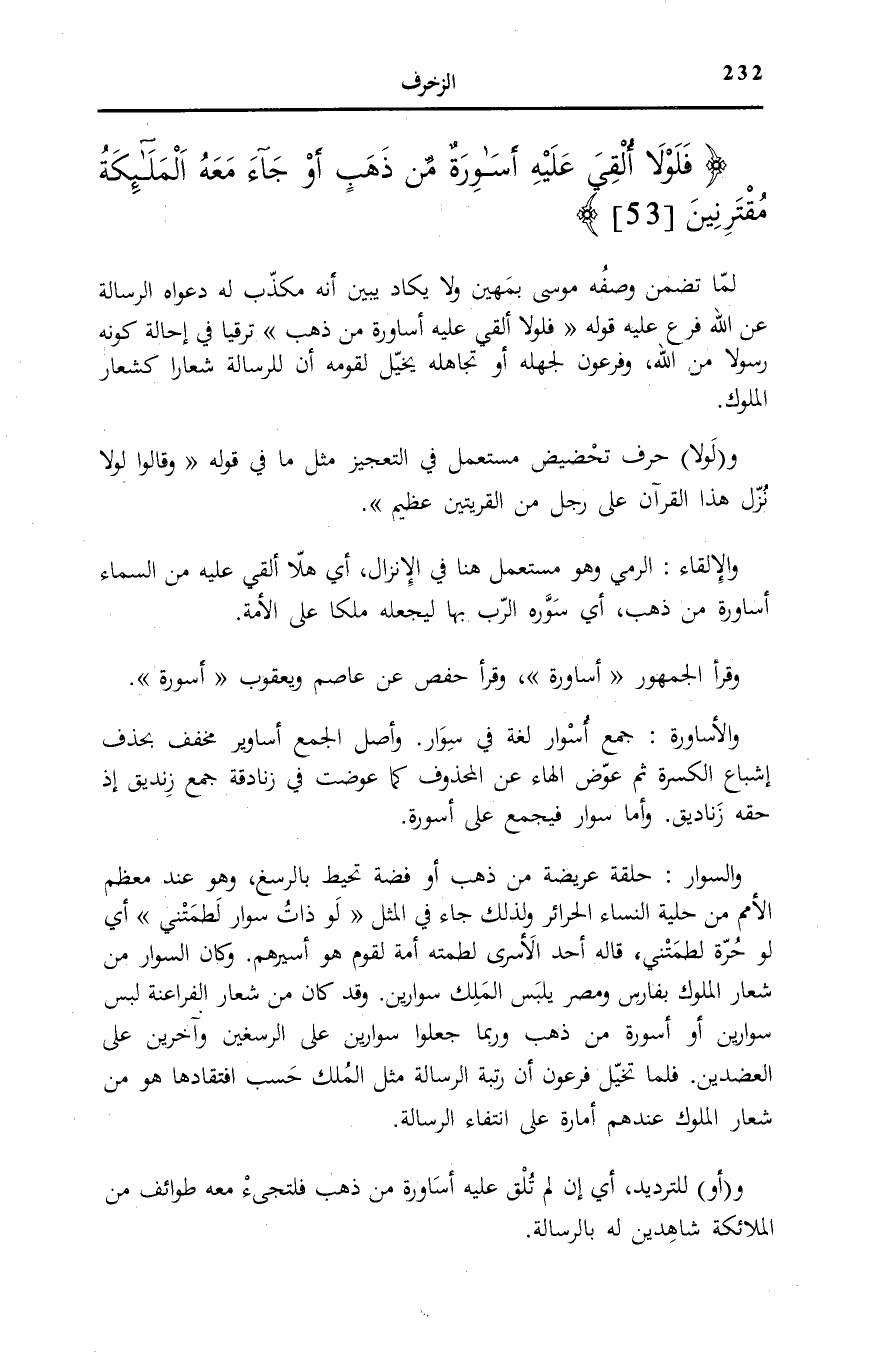 فَلَوْلا أُلْقِيَ عَلَيْهِ أَسْوِرَةٌ مِنْ ذَهَبٍ أَوْ جاءَ مَعَهُ الْمَلائِكَةُ مُقْتَرِنِينَ (53)