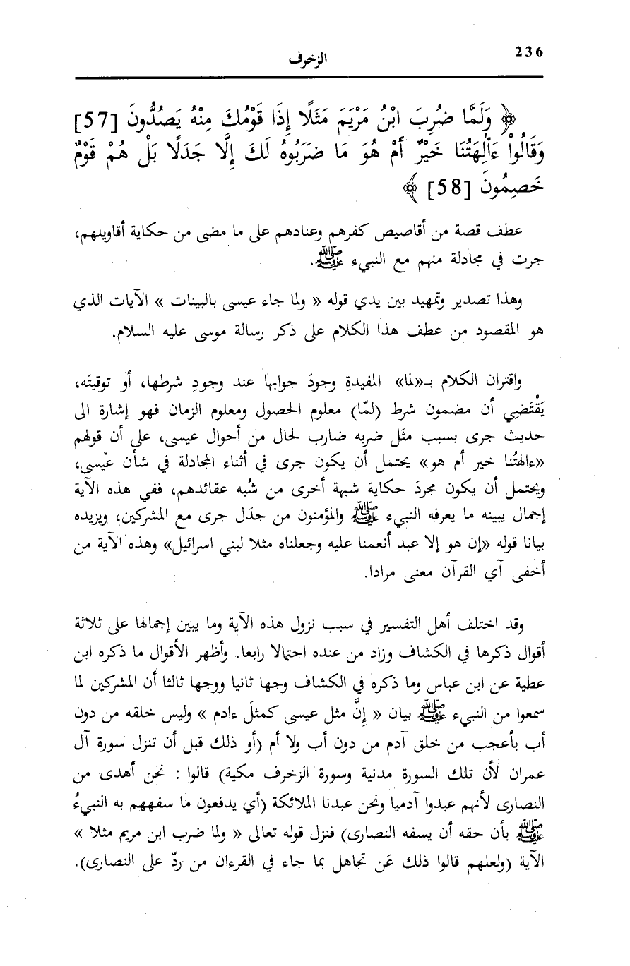 يَكُونَ جَرَى فِي أَثْنَاءِ الْمُجَادَلَةِ فِي شَأْنِ عِيسَى، وَيُحْتَمَلُ أَنْ يَكُونَ مُجَرَّدَ حِكَايَةِ شُبْهَةٍ أُخْرَى مِنْ شُبَهِ عَقَائِدِهِمْ، فَفِي هَذِهِ الْآيَةِ إِجْمَالٌ يُبَيِّنُهُ مَا يعرفهُ النبيء صَلَّى اللهُ عَلَيْهِ وَسَلَّمَ وَالْمُؤْمِنُونَ مِنْ جَدَلٍ جَرَى مَعَ الْمُشْرِكِينَ، وَيَزِيدُهُ بَيَانًا قَوْلُهُ: إِنْ هُوَ إِلَّا عَبْدٌ أَنْعَمْنا عَلَيْهِ وَجَعَلْناهُ مَثَلًا لِبَنِي إِسْرائِيلَ [الزخرف: 59] وَهَذِهِ الْآيَةُ مِنْ أَخْفَى آيِ الْقُرْآنِ مَعْنًى مُرَادًا.