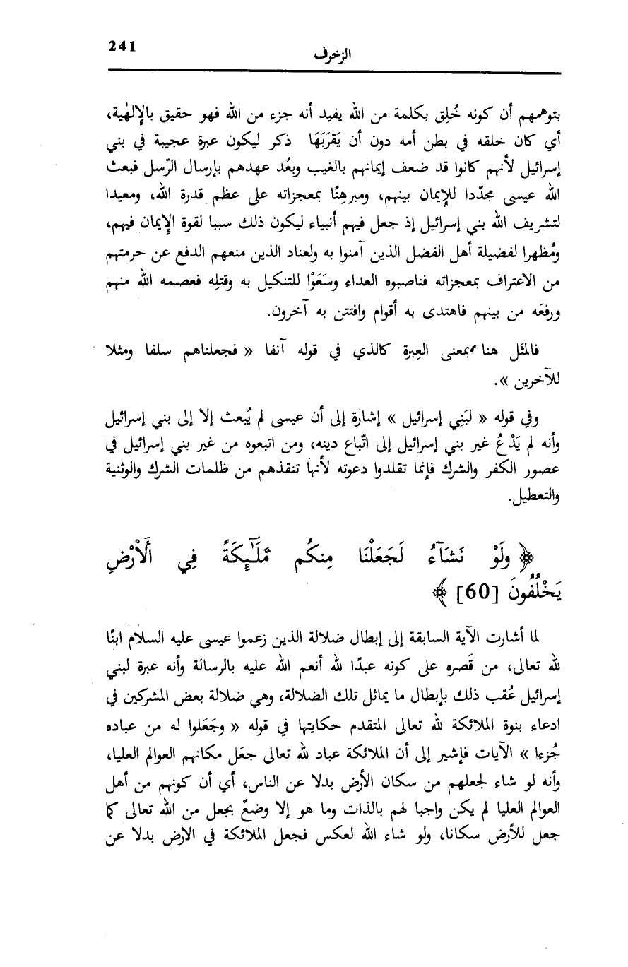 لَمَّا أَشَارَتِ الْآيَةُ السَّابِقَةُ إِلَى إِبْطَالِ ضَلَالَةِ الَّذِينَ زَعَمُوا عِيسَى عَلَيْهِ السَّلَامُ ابْنًا لِلَّهِ تَعَالَى، مِنْ قَصْرِهِ عَلَى كَوْنِهِ عَبْدًا لِلَّهِ أَنْعَمَ اللَّهُ عَلَيْهِ بِالرِّسَالَةِ وَأَنَّهُ عِبْرَةٌ لِبَنِي إِسْرَائِيلَ عُقِّبَ ذَلِكَ بِإِبْطَالِ مَا يُمَاثِلُ تِلْكَ الضَّلَالَةَ، وَهِيَ ضَلَالَةُ بَعْضِ الْمُشْرِكِينَ فِي ادِّعَاءِ بُنُوَّةِ الْمَلَائِكَةِ لِلَّهِ تَعَالَى الْمُتَقَدِّمِ حِكَايَتُهَا فِي قَوْلِهِ: وَجَعَلُوا لَهُ مِنْ عِبادِهِ جُزْءاً [الزخرف: 15] الْآيَاتِ فَأُشِيرَ إِلَى أَنَّ الْمَلَائِكَةَ عِبَادٌ لِلَّهِ تَعَالَى جَعَلَ مَكَانَهُمُ الْعَوَالِمَ الْعُلْيَا، وَأَنَّهُ لَوْ شَاءَ لَجَعَلَهُمْ مِنْ سُكَّانِ الْأَرْضِ بَدَلًا عَنِ النَّاسِ، أَيْ أَنَّ كَوْنَهُمْ مِنْ أَهْلِ الْعَوَالِمِ الْعُلْيَا لَمْ يَكُنْ وَاجِبًا لَهُمْ بِالذَّاتِ وَمَا هُوَ إِلَّا وَضْعٌ بِجَعْلٍ مِنَ اللَّهِ تَعَالَى كَمَا جَعَلَ لِلْأَرْضِ سُكَّانًا، وَلَوْ شَاءَ اللَّهُ لَعَكَسَ فَجَعَلَ الْمَلَائِكَةَ فِي الْأَرْضِ بَدَلًا عَنْ