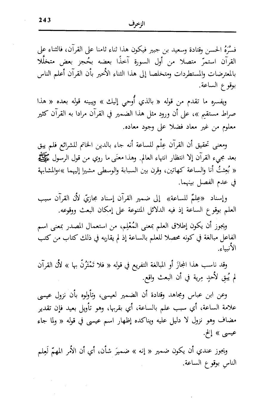 بَعِيدٌ فَإِنَّ تَقْدِيرَ مُضَافٍ وَهُوَ نُزُولُ لَا دَلِيلَ عَلَيْهِ وَيُنَاكِدُهُ إِظْهَارُ اسْمِ عِيسَى فِي قَوْلِهِ: وَلَمَّا جاءَ عِيسى [الزخرف: 63] إِلَخْ. وَيَجُوزُ عِنْدِي أَنْ يَكُونَ ضَمِيرُ إِنَّهُ ضَمِيرَ شَأْنٍ، أَيْ أَنَّ الْأَمْرَ الْمُهِمَّ لِعِلْمِ النَّاسِ بِوُقُوعِ السَّاعَةِ.