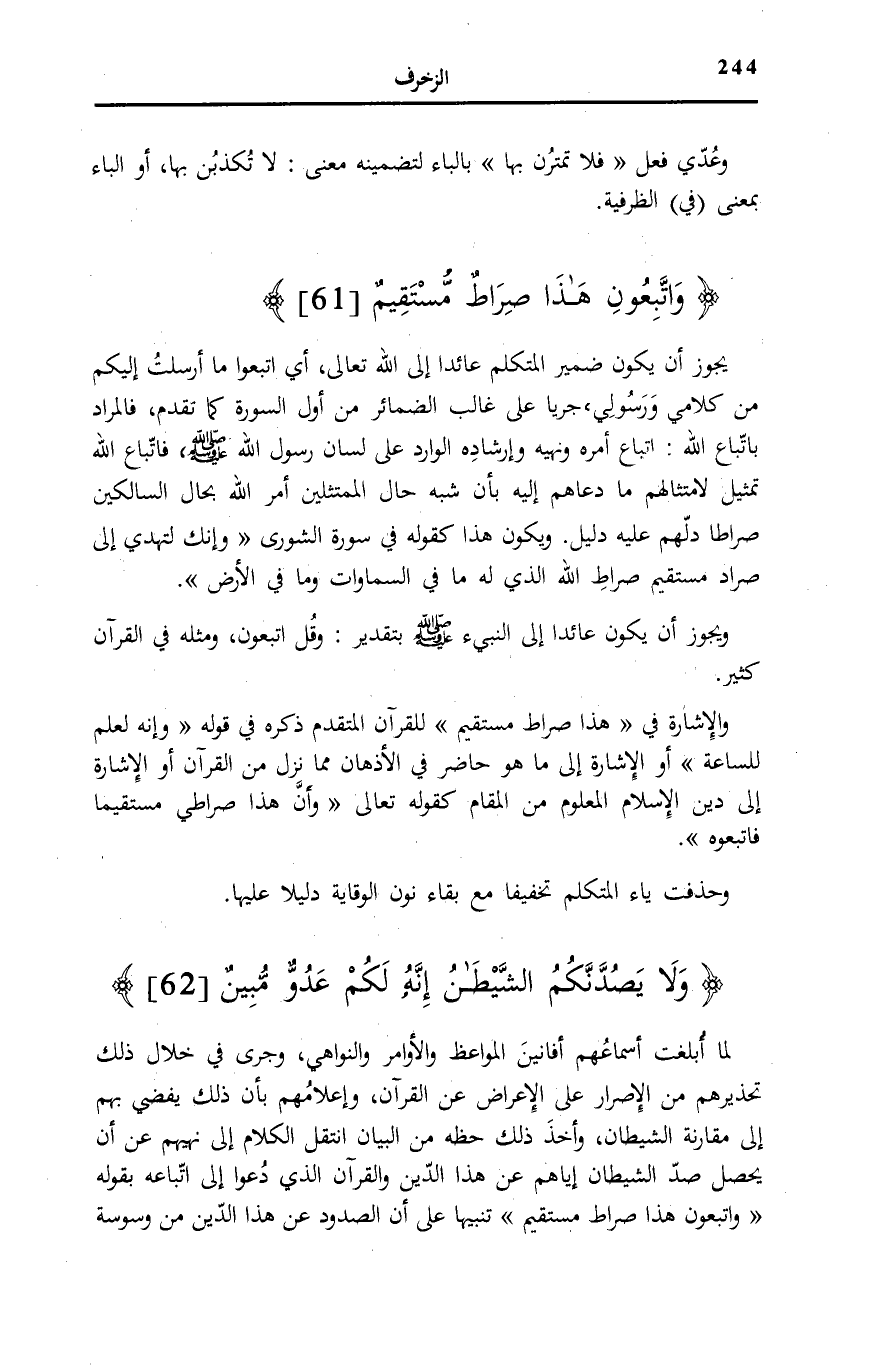 لَمَّا أُبْلِغَتْ أَسْمَاعُهُمْ أَفَانِينَ الْمَوَاعِظِ وَالْأَوَامِرِ وَالنَّوَاهِي، وَجَرَى فِي خِلَالِ ذَلِكَ تَحْذِيرُهُمْ مِنَ الْإِصْرَارِ عَلَى الْإِعْرَاضِ عَنِ الْقُرْآنِ، وَإِعْلَامُهُمْ بِأَنَّ ذَلِكَ يُفْضِي بِهِمْ إِلَى مُقَارَنَةِ الشَّيْطَانِ، وَأَخَذَ ذَلِكَ حَظَّهُ مِنَ الْبَيَانِ انْتَقَلَ الْكَلَامُ إِلَى نَهْيِهِمْ عَنْ أَنْ يَحْصُلَ صَدُّ الشَّيْطَانِ إِيَّاهُمْ عَنْ هَذَا الدِّينِ وَالْقُرْآنِ الَّذِي دَعَوَا إِلَى اتِّبَاعِهِ بِقَوْلِهِ: وَاتَّبِعُونِ هَذَا صِراطٌ مُسْتَقِيمٌ [الزخرف: 61] تَنْبِيهًا عَلَى أَنَّ الصُّدُودَ عَنْ هَذَا الدِّينِ مِنْ وَسْوَسَةِ