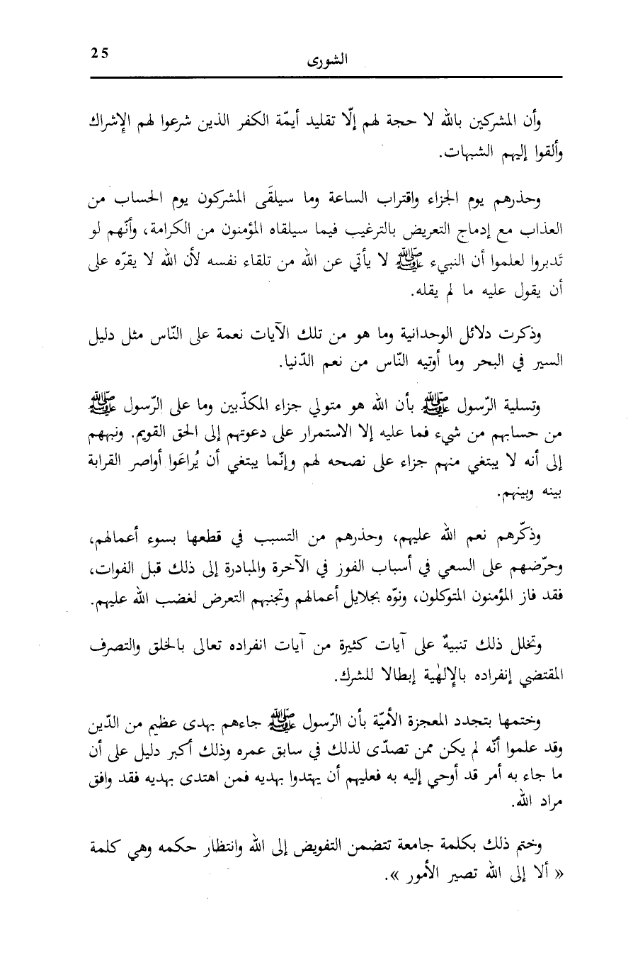 وَخَتَمَهَا بِتَجَدُّدِ الْمُعْجِزَةِ الْأُمِّيَّةِ بِأَن الرّسول صَلَّى اللهُ عَلَيْهِ وَسَلَّمَ جَاءَهُمْ بِهُدًى عَظِيمٍ مِنَ الدِّينِ وَقَدْ عَلِمُوا أَنَّهُ لَمْ يَكُنْ مِمَّنْ تَصَدَّى لِذَلِكَ فِي سَابِقِ عُمُرِهِ وَذَلِكَ أَكْبَرُ دَلِيلٍ عَلَى أَنَّ مَا جَاءَ بِهِ أَمْرٌ قَدْ أُوحِيَ إِلَيْهِ بِهِ فَعَلَيْهِمْ أَنْ يَهْتَدُوا بِهَدْيِهِ فَمَنِ اهْتَدَى بِهَدْيِهِ فَقَدْ وَافَقَ مُرَادَ اللَّهِ. وَخَتَمَ ذَلِكَ بِكَلِمَةٍ جَامِعَةٍ تَتَضَمَّنُ التَّفْوِيضَ إِلَى اللَّهِ وَانْتِظَارَ حُكْمِهِ وَهِيَ كَلِمَةُ أَلا إِلَى اللَّهِ تَصِيرُ الْأُمُورُ [الشورى: 53] .
