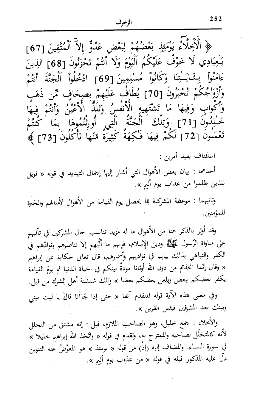الْأَخِلاَّءُ يَوْمَئِذٍ بَعْضُهُمْ لِبَعْضٍ عَدُوٌّ إِلاَّ الْمُتَّقِينَ (67) يَا عِبادِ لَا خَوْفٌ عَلَيْكُمُ الْيَوْمَ وَلا أَنْتُمْ تَحْزَنُونَ (68) الَّذِينَ آمَنُوا بِآياتِنا وَكانُوا مُسْلِمِينَ (69) ادْخُلُوا الْجَنَّةَ أَنْتُمْ وَأَزْواجُكُمْ تُحْبَرُونَ (70) يُطافُ عَلَيْهِمْ بِصِحافٍ مِنْ ذَهَبٍ وَأَكْوابٍ وَفِيها مَا تَشْتَهِيهِ الْأَنْفُسُ وَتَلَذُّ الْأَعْيُنُ وَأَنْتُمْ فِيها خالِدُونَ (71)