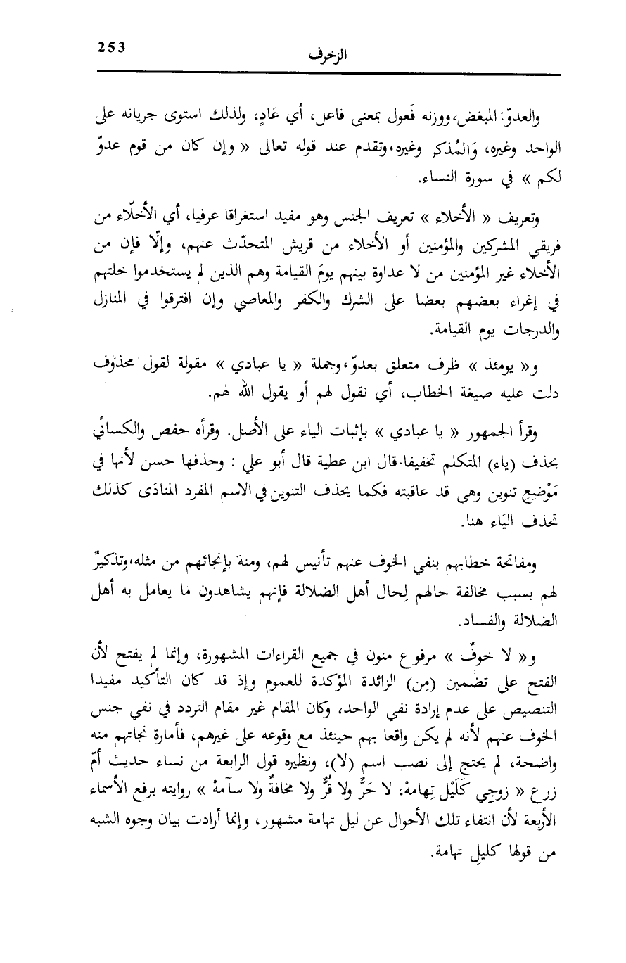 ويَوْمَئِذٍ ظرف مُتَعَلق بعدوّ، وَجُمْلَة يَا عِبادِ مَقُولَةٌ لِقَوْلٍ مَحْذُوفٍ دَلَّتْ عَلَيْهِ صِيغَةُ الْخِطَابِ، أَيْ نَقُولُ لَهُمْ أَوْ يَقُولُ اللَّهُ لَهُمْ. وَقَرَأَ الْجُمْهُورُ يَا عِبَادِي بِإِثْبَاتِ الْيَاءِ عَلَى الْأَصْلِ. وَقَرَأَهُ حَفْصٌ وَالْكِسَائِيُّ بِحَذْفِ (يَاءِ) الْمُتَكَلِّمِ تَخْفِيفًا. قَالَ ابْنُ عَطِيَّةَ قَالَ أَبُو عَلِيٍّ: وَحَذْفُهَا حَسَنٌ لِأَنَّهَا فِي مَوْضِعِ تَنْوِينٍ وَهِيَ قَدْ عَاقَبَتْهُ فَكَمَا يُحْذَفُ التَّنْوِينُ فِي الِاسْمِ الْمُفْرَدِ الْمُنَادَى كَذَلِكَ تُحْذَفُ الْيَاءُ هُنَا.